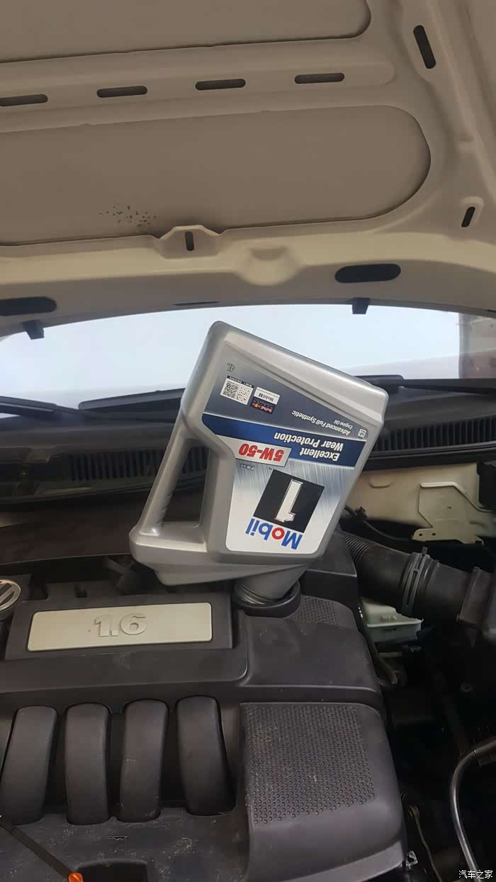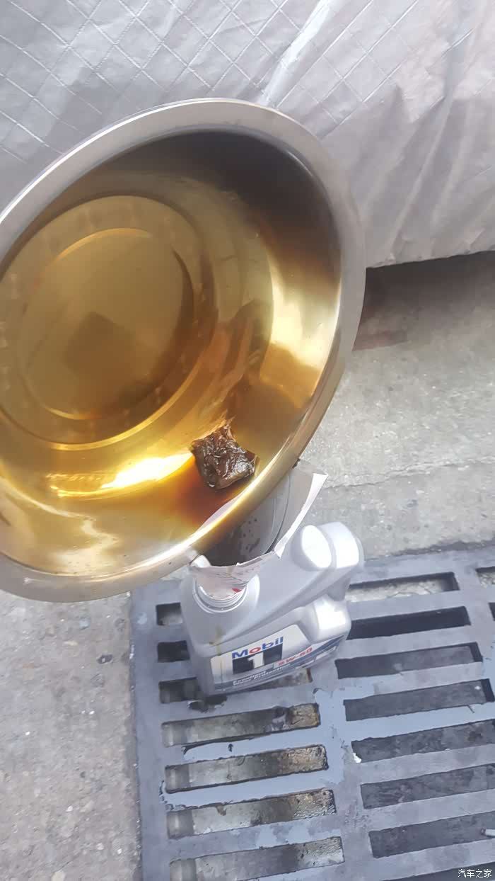 上好了机油滤芯跟机油螺丝,开始加入新机油了,银装美孚好油,直接倒入一瓶四升装的再倒入一升装的那瓶百分子30,就等于4.3升,机油尺一量够了。