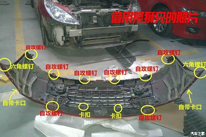 借图,这个图真的好用,鄙人奉为经典。用千斤顶顶起车侧面,直接盲摸即可拆卸保险杠下的螺丝,注意靠中间是T30的,靠两侧的是T20的。图中两侧六角螺母是10个的扳手