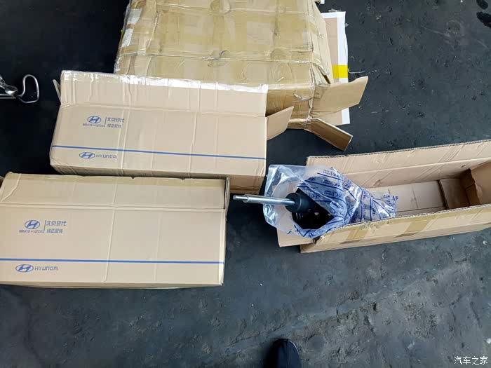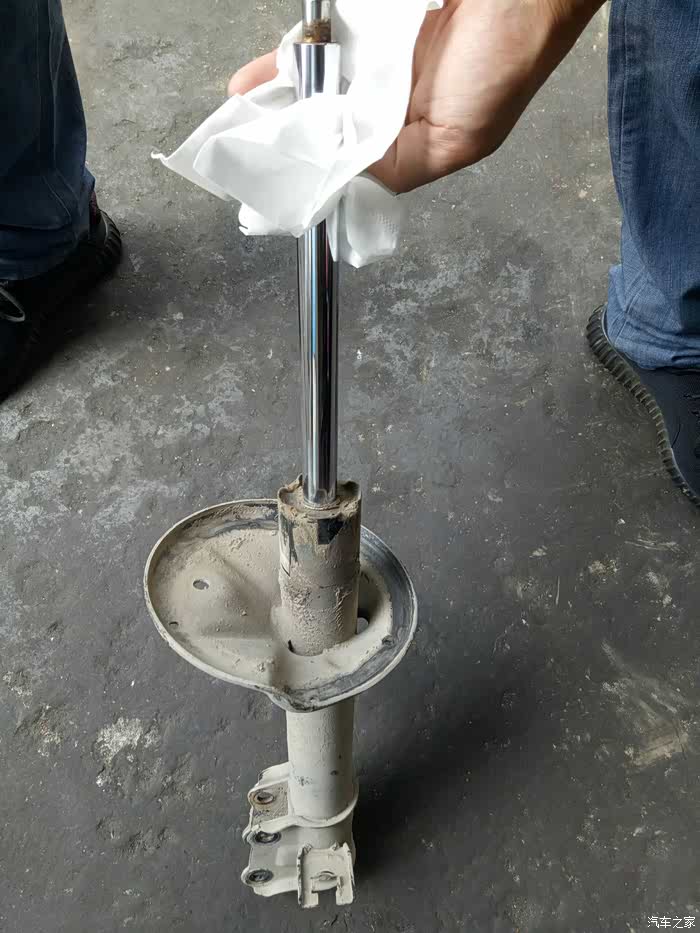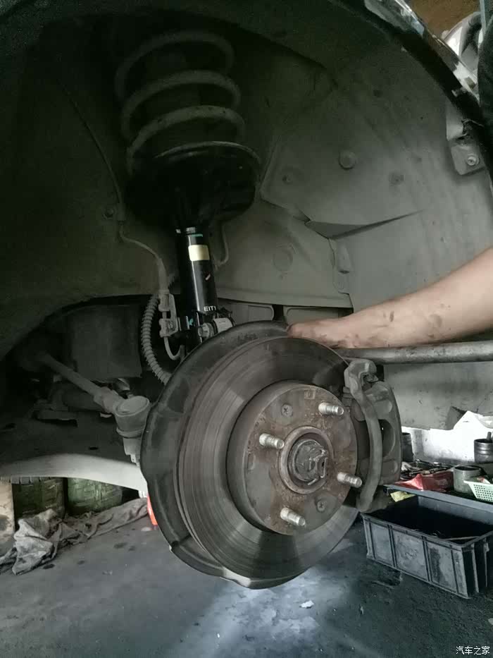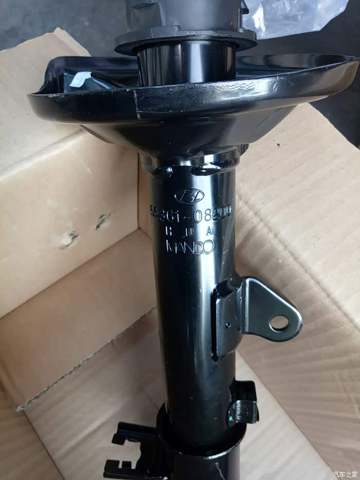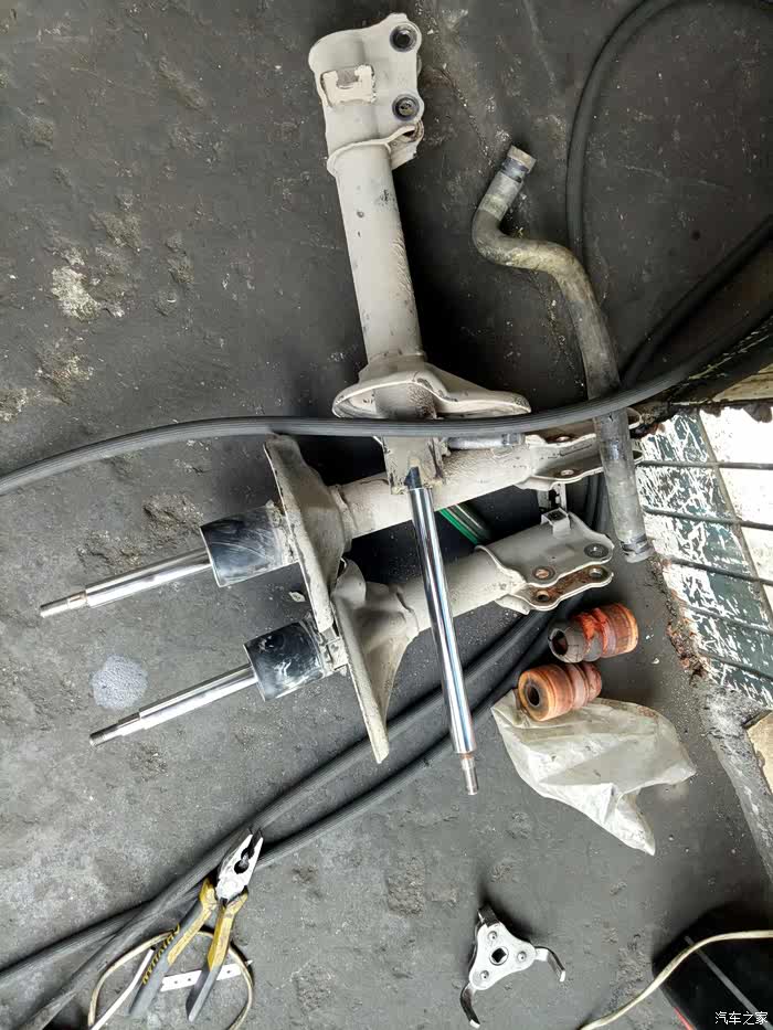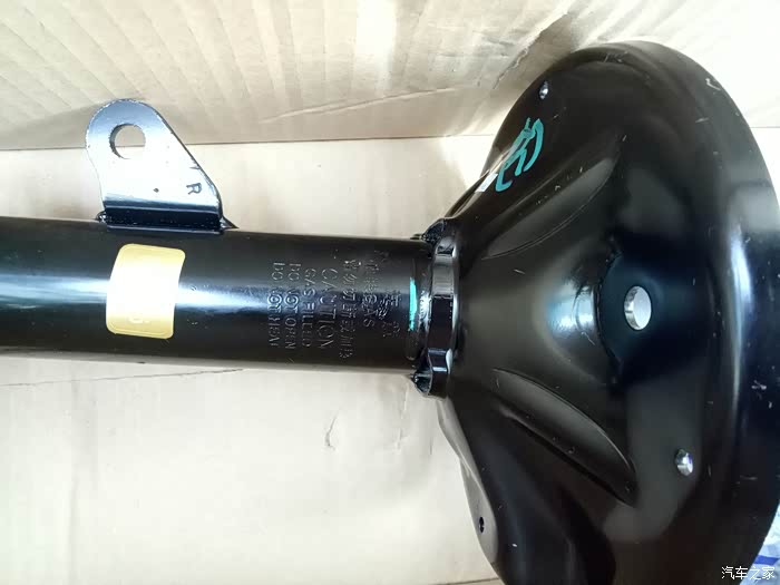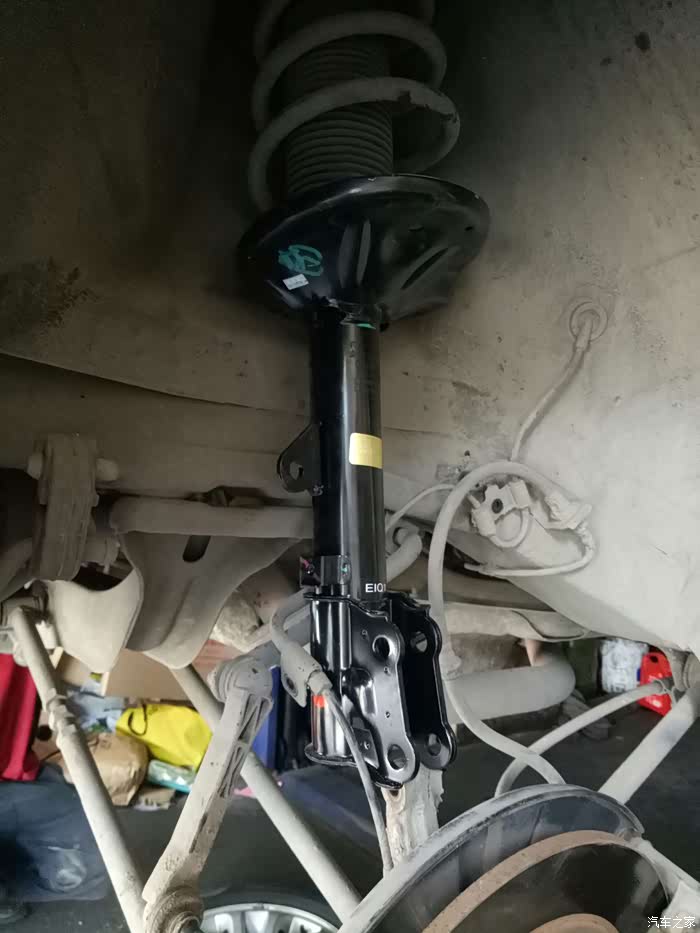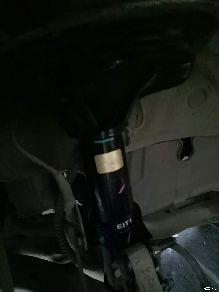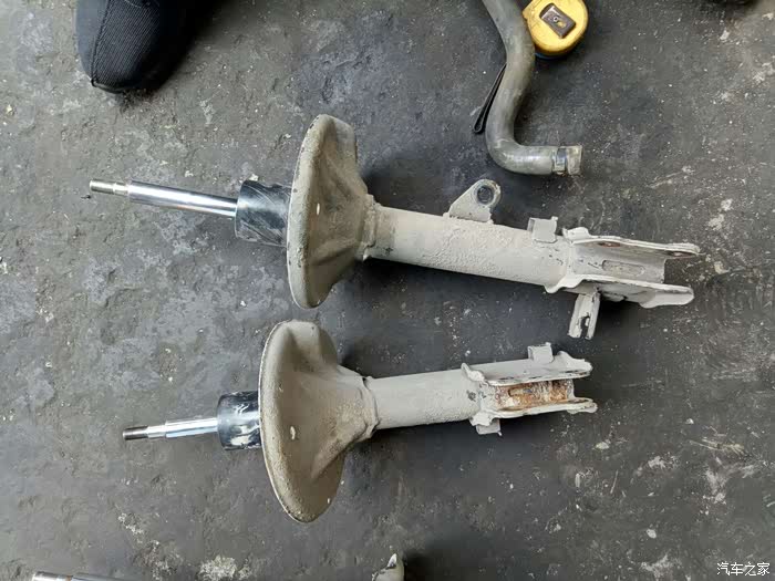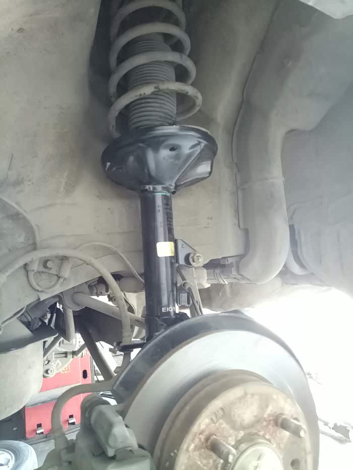 去年保养时发现左前轮减震漏油!换了一条减震!老板建议换两条!不然会不平衡!我看了看右边的减震,没出现漏油的情况!就只换了一只!一直到最近总觉得后边两个减震也有问题!过坑洼不平路面!有轻微的咯噔咯噔异响!听着实在难受!高速时方向也有轻微偏右!(之前做过两次动平衡和4轮定位都未解决,估计是只换了一条减震的原因吧?)有强迫症的我,第二天就一早开到朋友店里准备更换剩余的3根减震!好了上图!