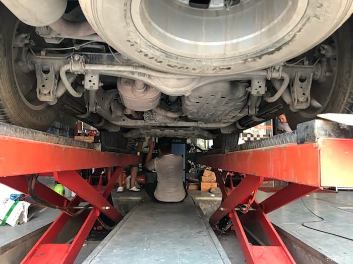 上架子开始保养,车子太大,举升机不敢举太高,?? 眼看要碰头,小伙子只能做地下,委屈这个小胖子了。