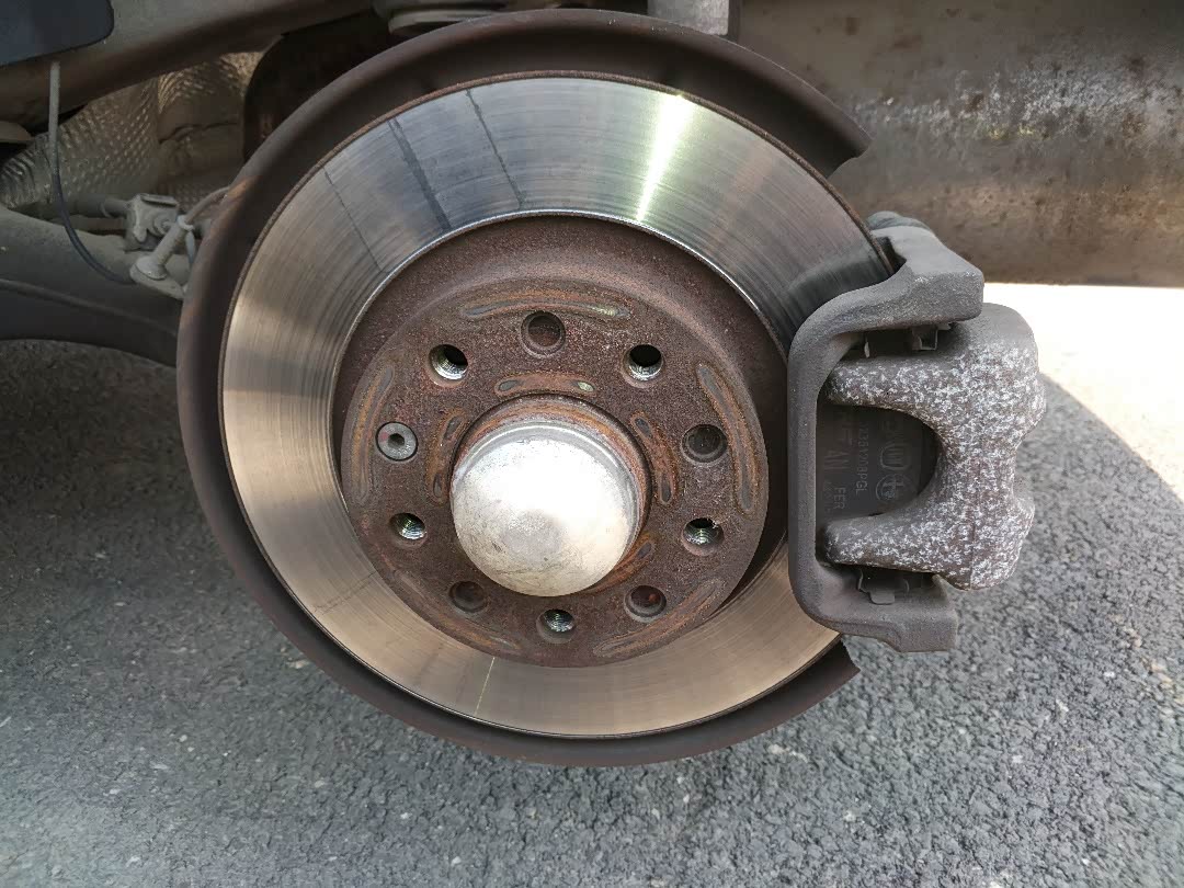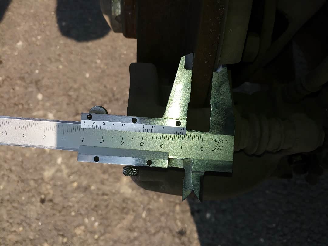 顺便检查一下刹车盘磨损情况,盘的边缘测量是10.2左右吧,往里走有凹陷估计9.9左右吧。