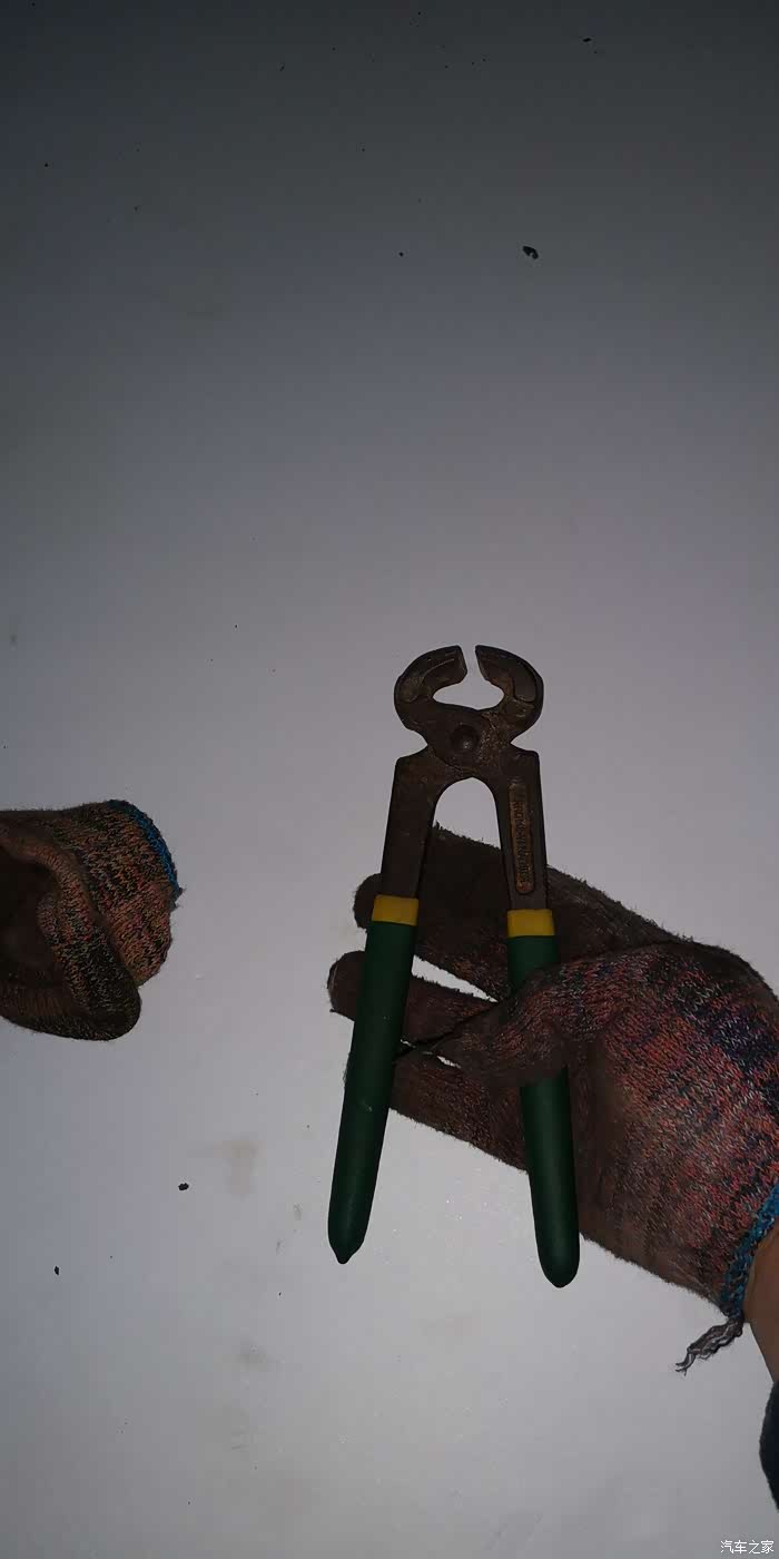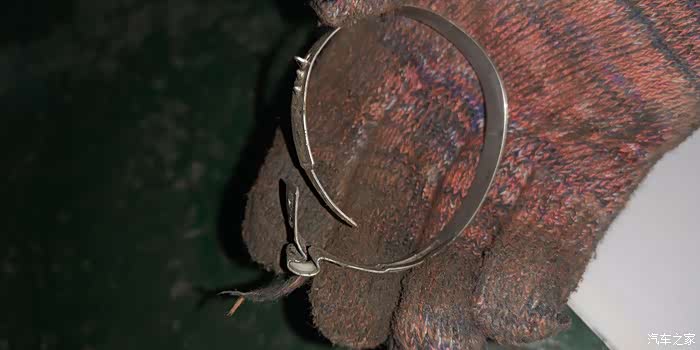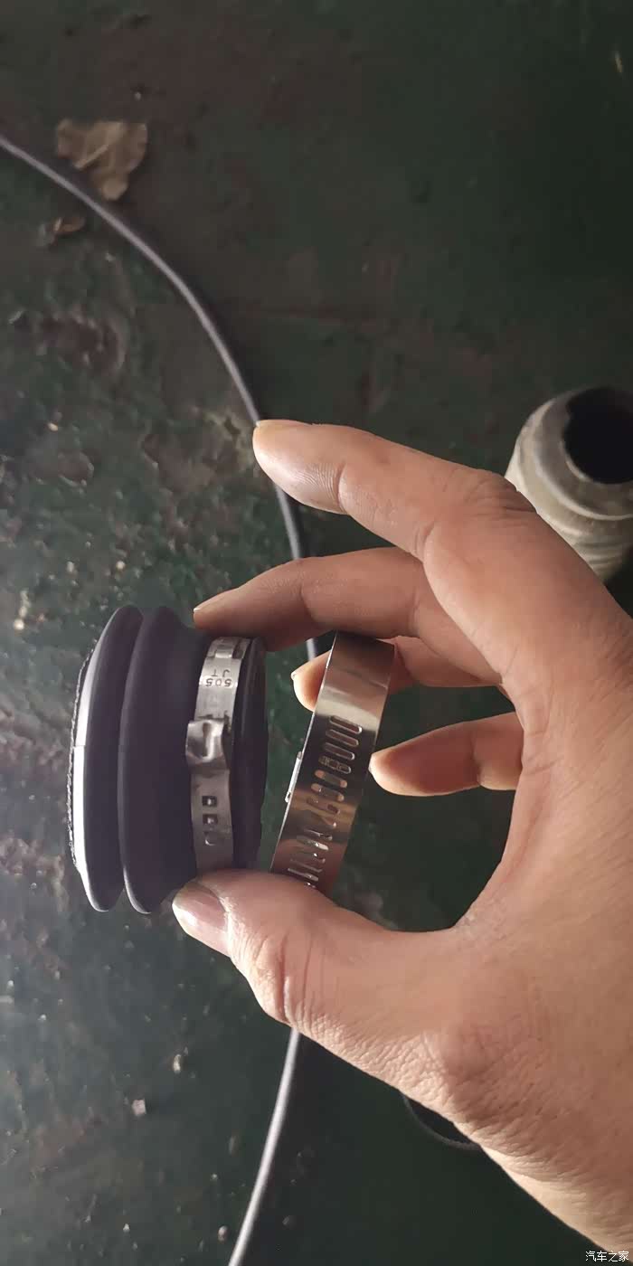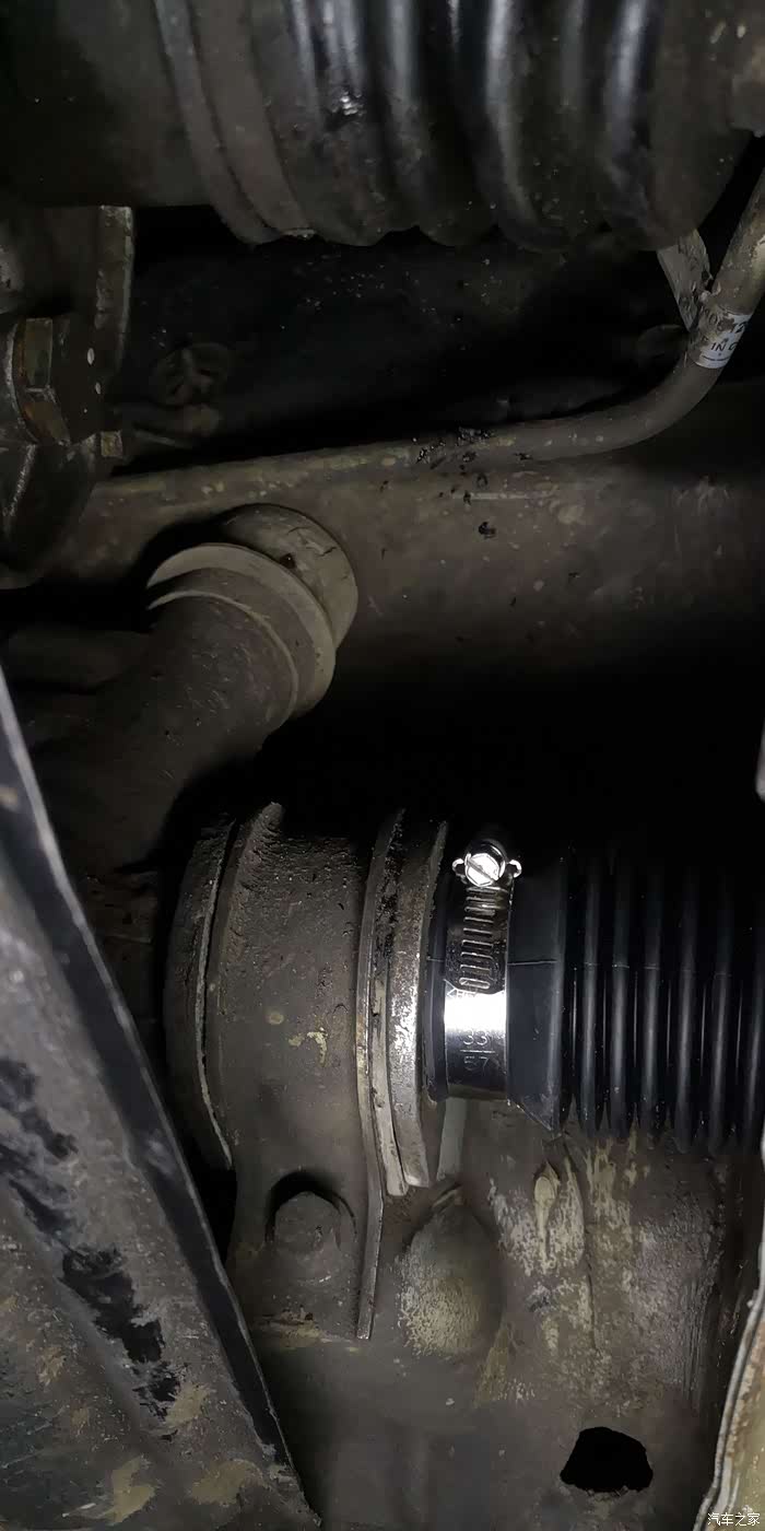 然后钻到车底,把保护套里面的不锈钢卡箍卸了,这个卡箍一般情况下弄下来就装不上,装上去也会费时间,所以干脆 买2个卡箍备用就好了。中间这个凸起用螺丝刀撬下来,看不到就转转保护套