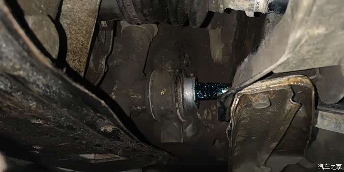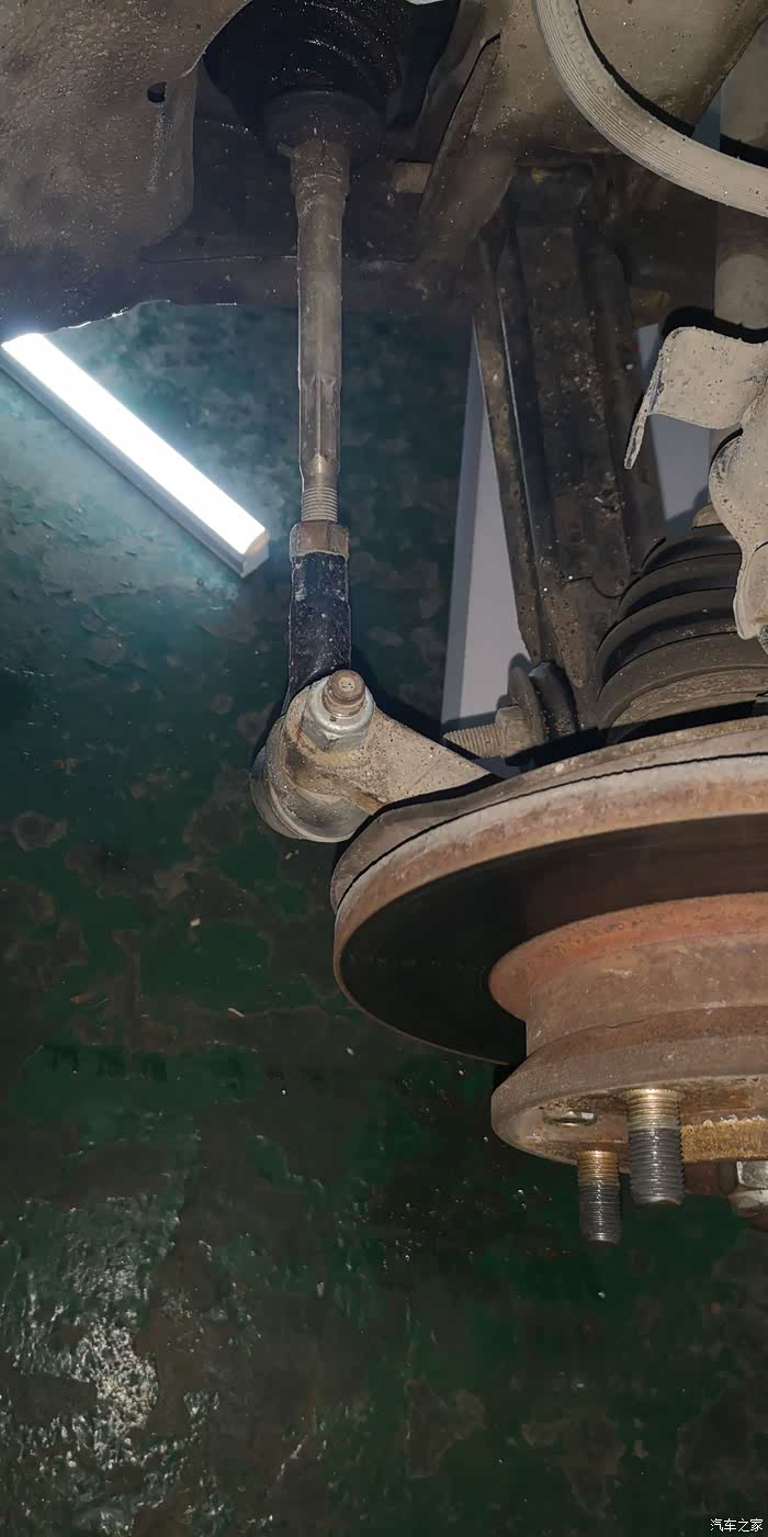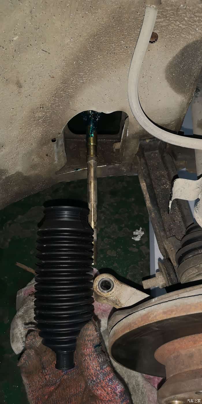 为了方便更换,升级轮胎之前先把车轮螺丝松开,顶起来后把轮子卸了,就可以看到球头和保护套了
