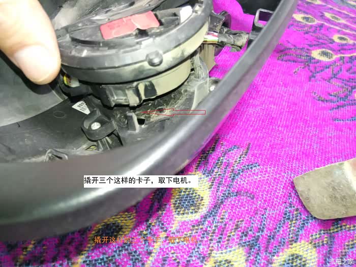 用一字螺丝刀撬开三个卡子,取下电机。