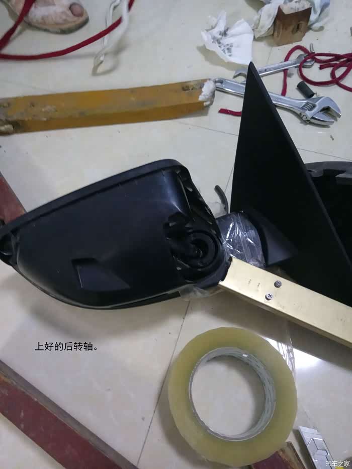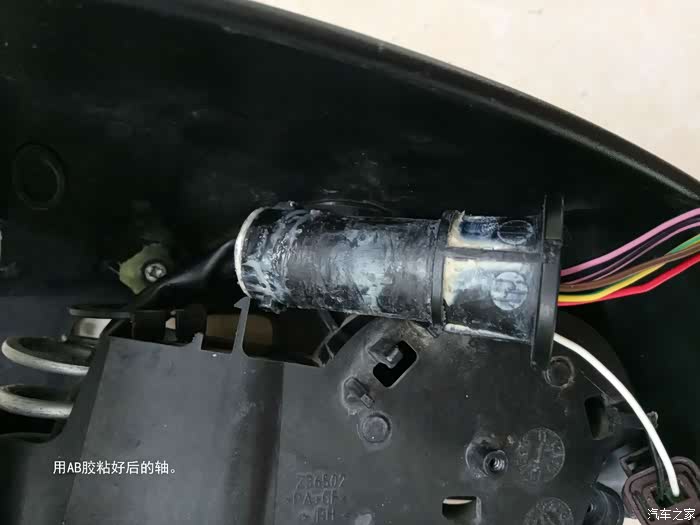 轴下边如有盖,长螺丝穿过轴心两边用力很容易能把轴压上。很多后视镜轴下面都有一个小盖子。