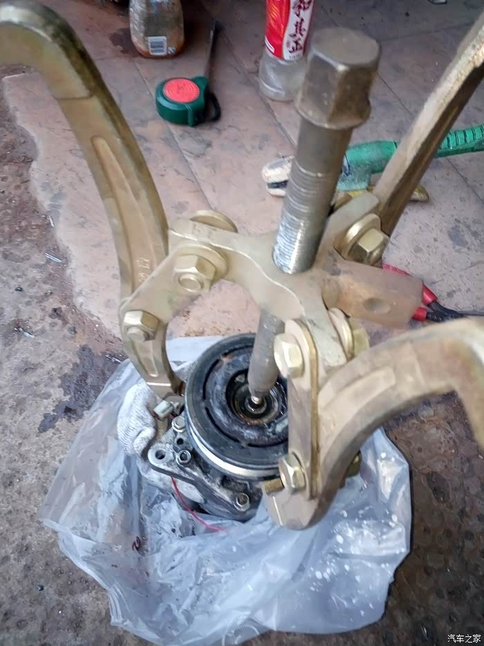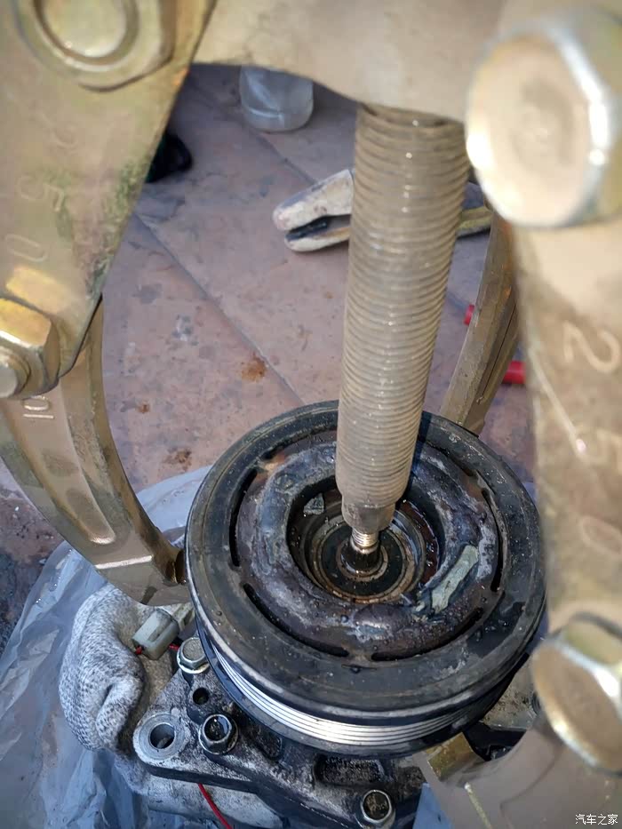 拆压缩机螺栓上边是10mm的下边是13mm的,完了就能把压缩机拿下来了,本来没打算拆压缩机,皮带轮已断裂里边的无法用拉马拉