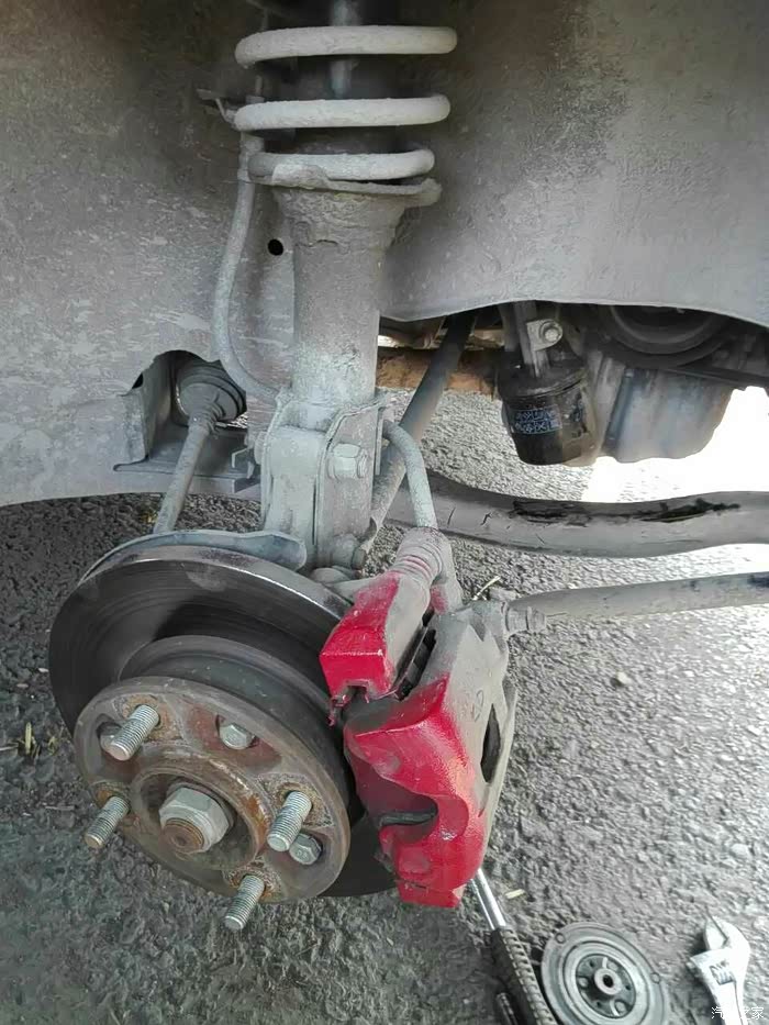 先支好轮胎用千斤顶打起缺掉副驾驶侧轮胎,卸掉护板