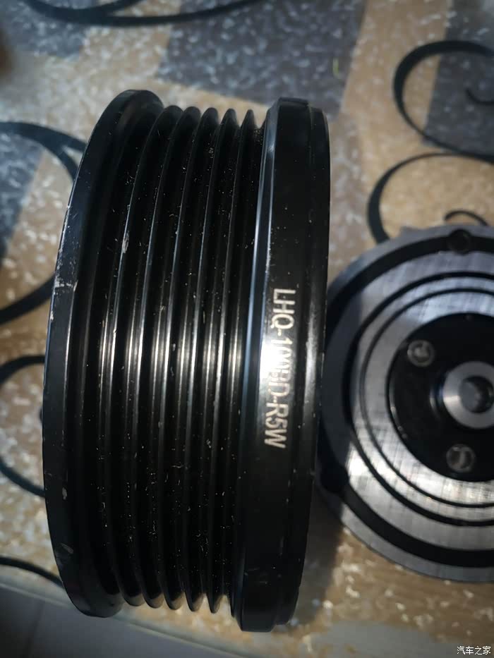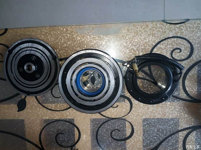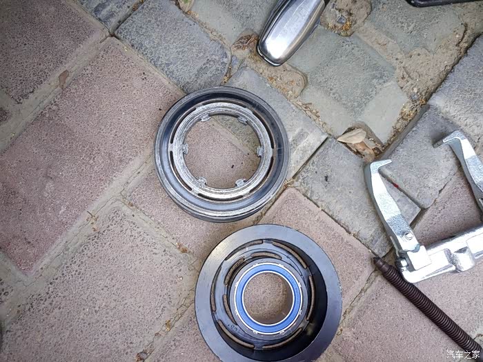 天已经黑了,安装皮带轮也没拍照,先装线圈装卡簧,注意卡簧的平面的那边是朝里的,装皮带轮手一推就装上了,装固定卡簧下来装压盘压盘中心孔是花键在压缩机轴上的,有一个定位键比别的大,位置不对装不上,压盘与皮带轮中间原厂的有一薄一厚两个调整垫,这个牵扯到压盘与皮带轮的间隙,我先都装上了,用电瓶正负极直接接磁线圈用手大概盘下压盘与皮带轮接合还可以。