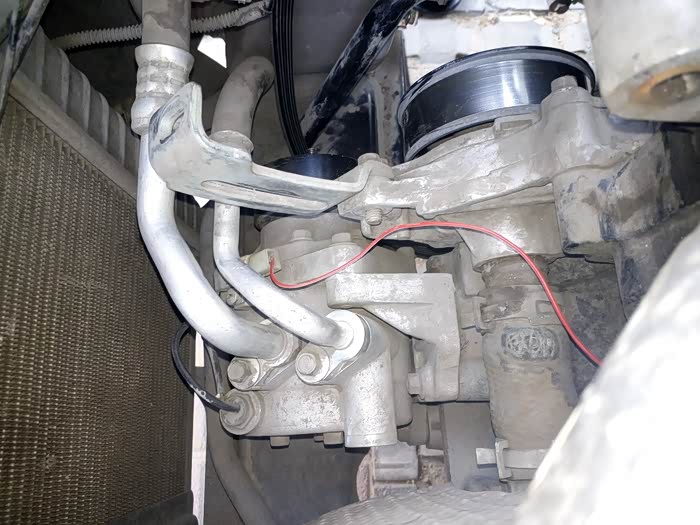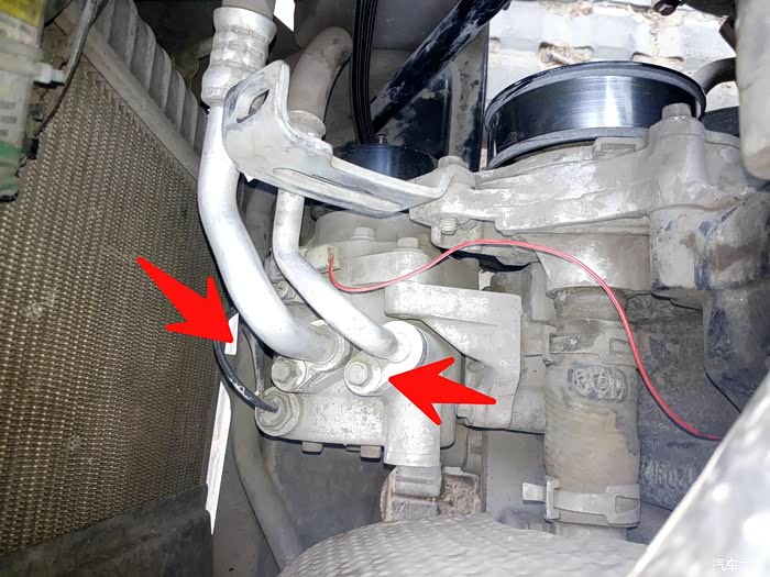 开始拆压缩机高低压管两个位置10mm螺栓,松螺栓时先松一点轻轻晃晃管子让制冷剂慢慢跑出,以防危险。取下时把两个管子头用布包下,压缩机上的两个孔也塞点布防进杂物