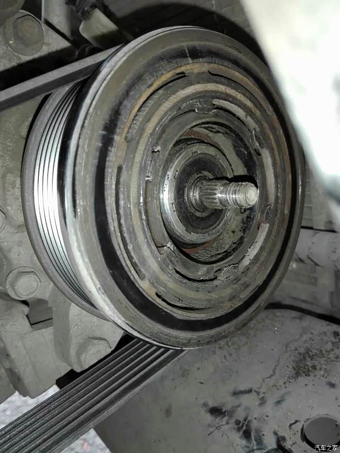 这是压缩机皮带轮断裂的情形,造成与外压盘压死分离不开,一打车压缩机就工作,更换的就是这部位