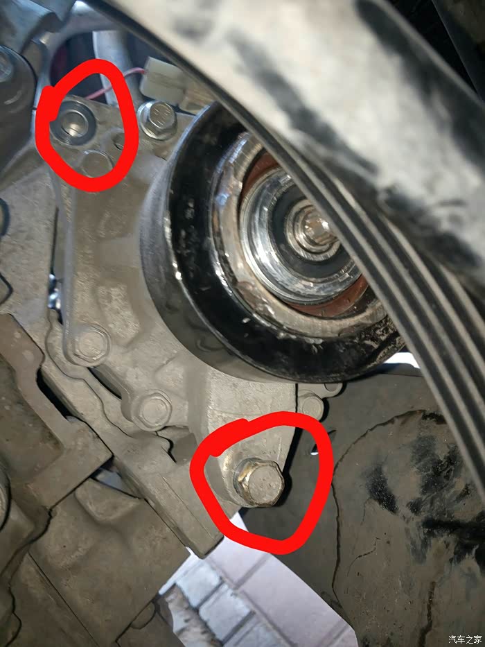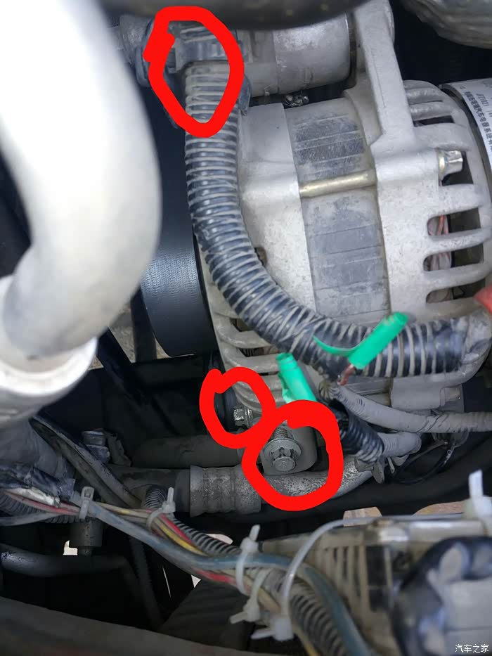 松发电机皮带顺便卸掉,先拆掉发电机线一个插头一根输出线把输出线用胶布先粘下以防短路,先松小红圈的锁紧螺栓,这条螺栓要拿掉要不发电机拿不下,逆时针松紧邻的调整螺栓也要取掉,最后拆最上边的固定底座自螺栓13mm的,拆掉发电机就可拿下了记住各部位螺栓放好地方