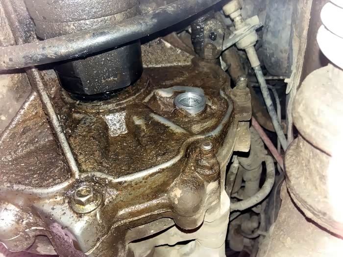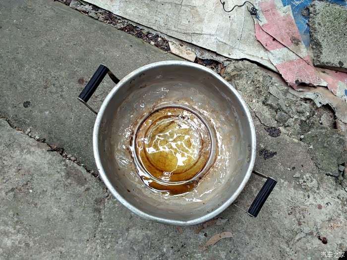 找了个废弃的铝锅接废油,由于刚好放在出油口下面,拆出螺丝时废油喷出有20厘米远,很多都流到地上了