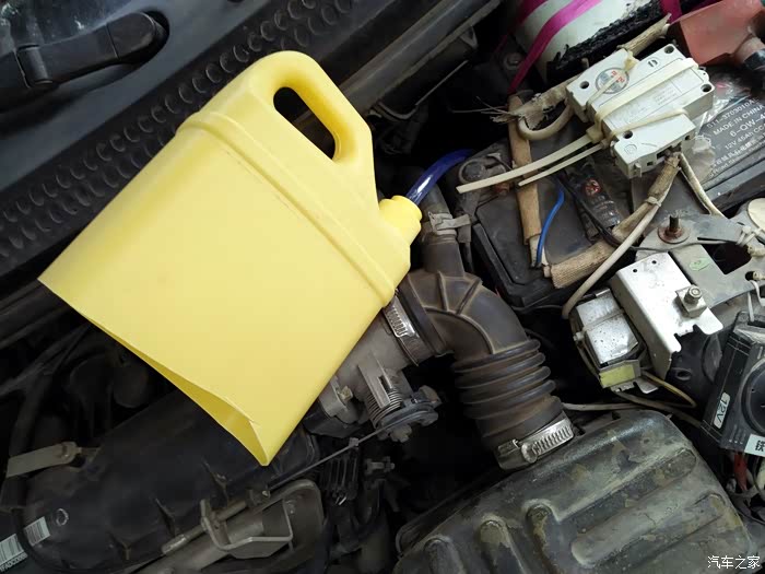倒进一半后开始满出来了,到这个位置证明已经加够了,上面掐紧管子,我在下面抽出来把多余的放回瓶子