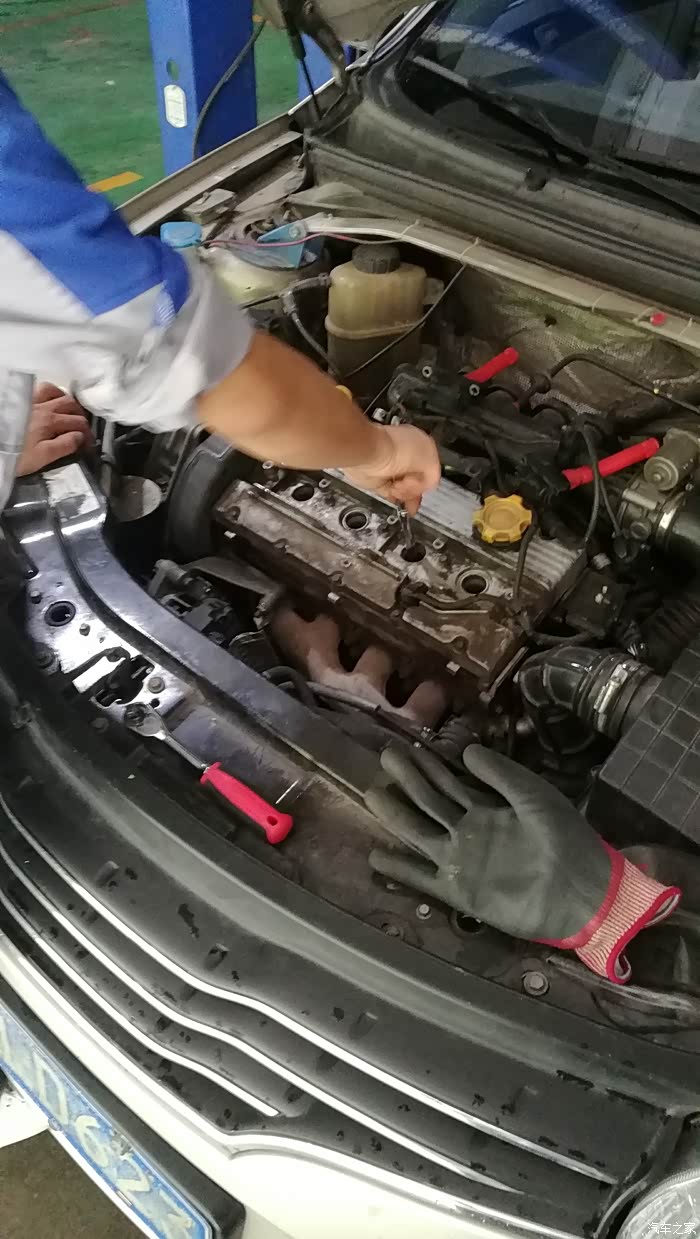 第一步,拆掉火花塞,清洗燃烧室!照片上的手套和工具都是我随车的,这修理厂是我朋友的,我朋友说就见我能来修个车,不但自己动手,还自带全套修车工具的!话说会修车的男人不是很帅气么?