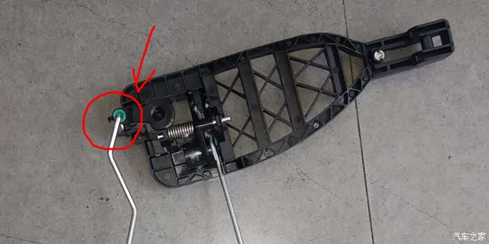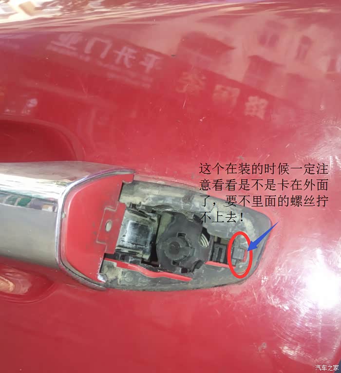 接着就是把新的给装上去,装的步骤简单,怎么拆的就怎么装就行了,这里要着重说一下,在装外拉手的时候,往下拉一下上图未标注圆圈的铁杆,这样外拉手就很轻松的装上去了。