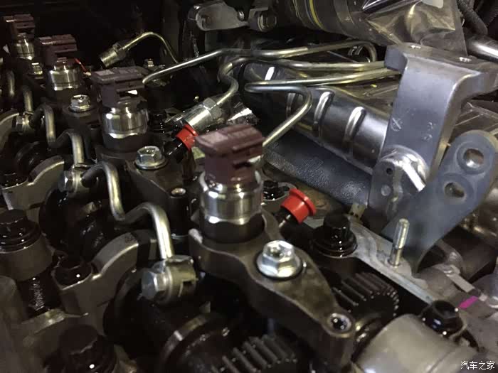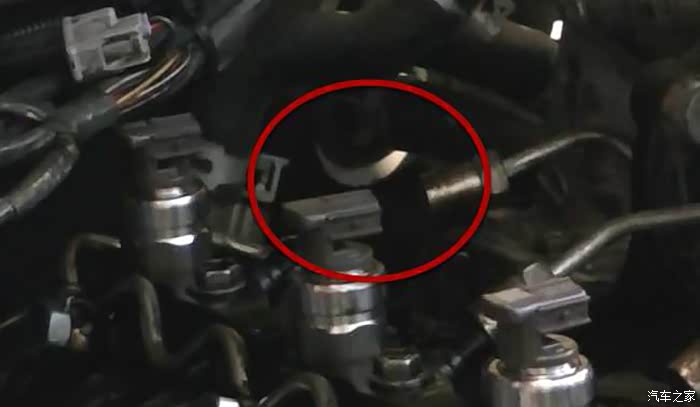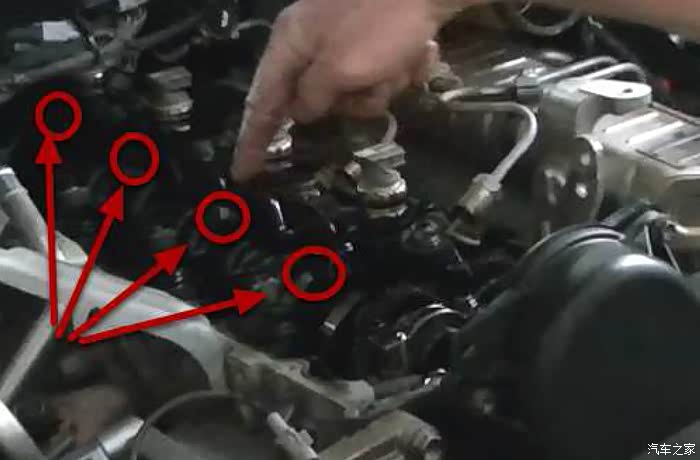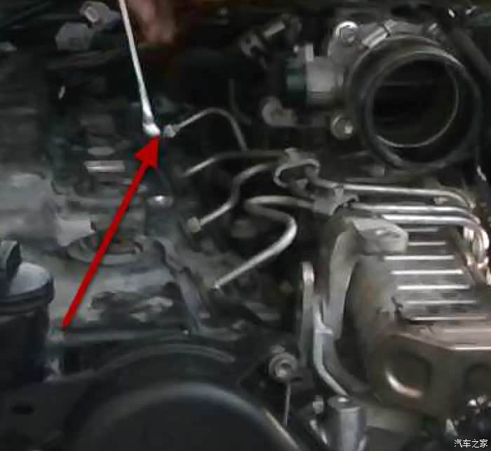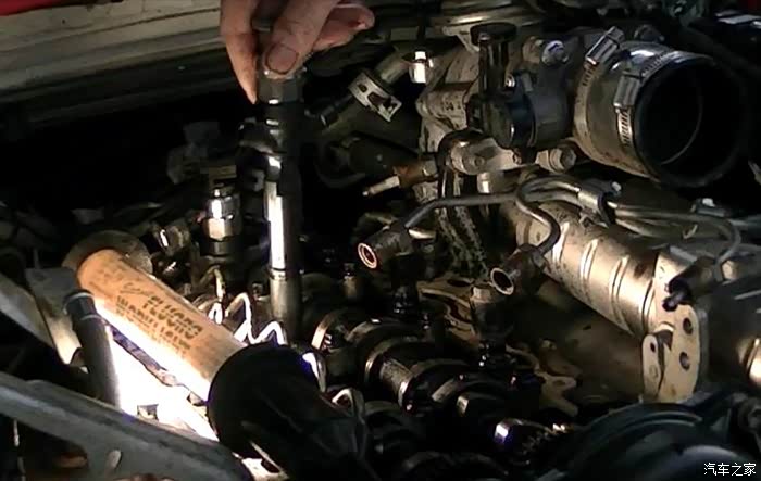 拧开油轨上的四个油管接头,这里要注意油轨上有五个管子,中间的是高压泵的进油管