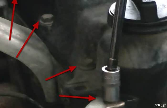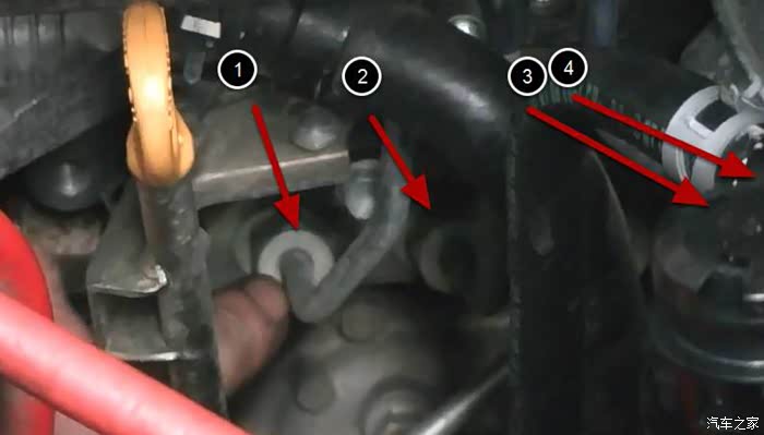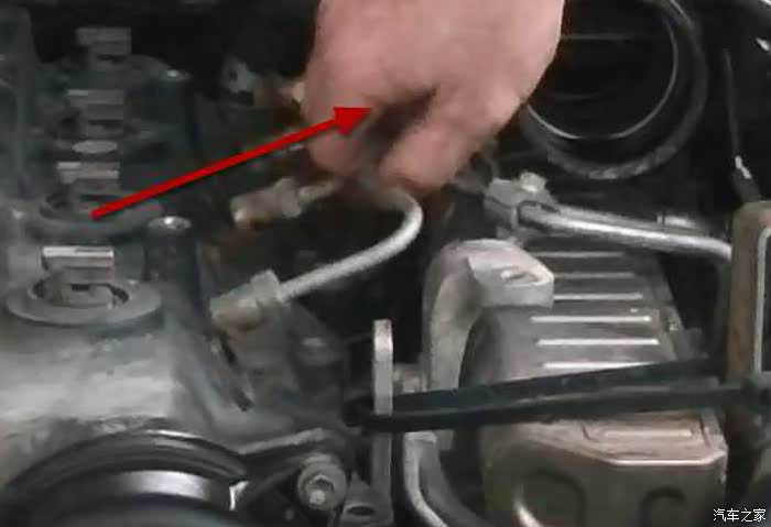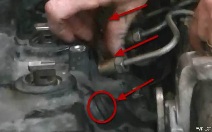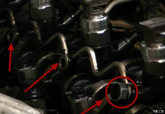 四条油管上下都拧开之后就可以往箭头放心轻轻提一下油管了,这里为了省事就不把四条油管都拧下来了