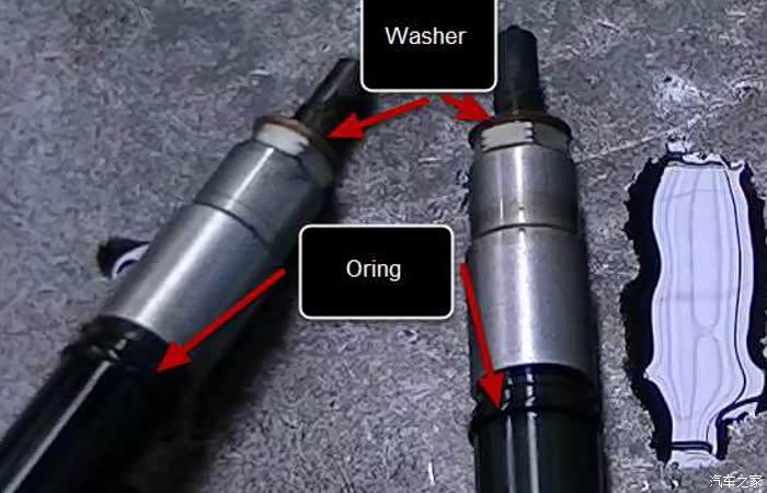 拆下来的老喷油嘴和新喷油嘴,可以仔细看第二根喷油嘴上有一个垫片,这是新款垫片是铝合金的,而老款有铜垫片的非常容易烧变形引起气缸燃气窜入上盖进而污染机油导致oil pick up我不知道中文是什么就是油泵下面那个滤网堵死,这样会导致润滑不良机油结焦严重的会活塞漏窟窿。