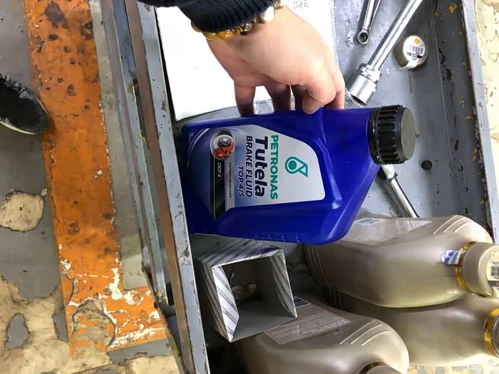 这是4S店的刹车油,旁边就是我自带的机油!