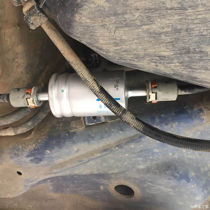 汽油滤芯在右后轮差不多的位置,外面一个固定的铁皮壳,卸掉铁壳上的螺丝,汽油滤芯就露出来了。