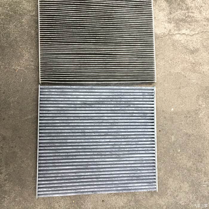 新旧空调滤对比,上旧下新,上面旧的比下面新的更像活性炭。