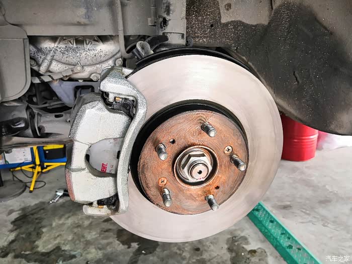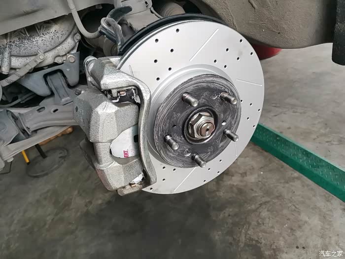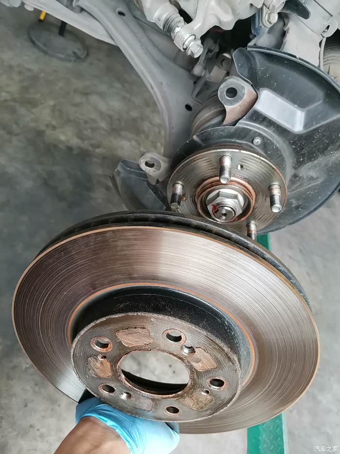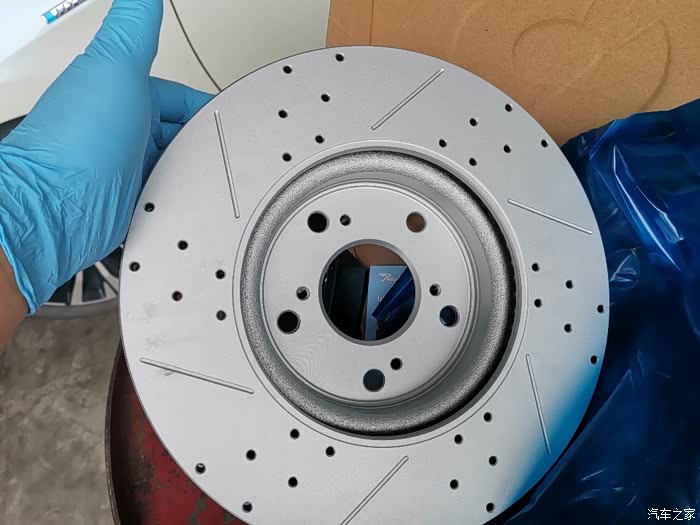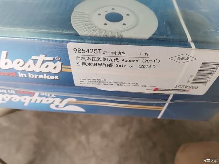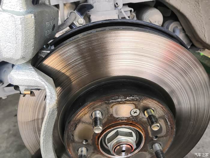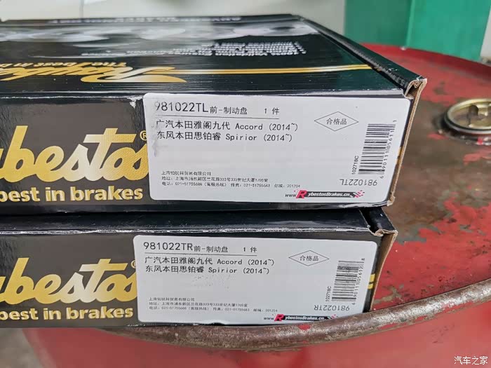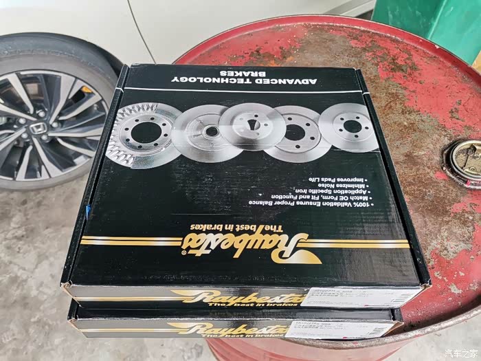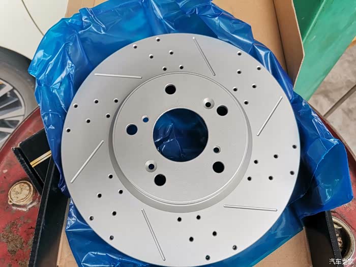 9.5代混合动力雅阁行驶3万多公里,其他地方都很满意,唯独就是刹车不太满意。为什么不满意呢,就是前刹车经常异响,而且前刹车盘布满一条条坑。刚开始是更换了雷贝斯托的刹车皮,而且抛光了前刹车盘,刹车效果和异响已经很大改善。不过用了一段时间,前刹车盘又布满了一条条的小坑,而且在刹车刚松脚或者刚刹停的时候会有很低沉的响声,这个应该就是原车刹车盘的材质偏软的问题了。追求完美的我,于是决定把原车的刹车盘更换掉,用雷贝斯托的打孔划线盘。好了,下面开始上图。