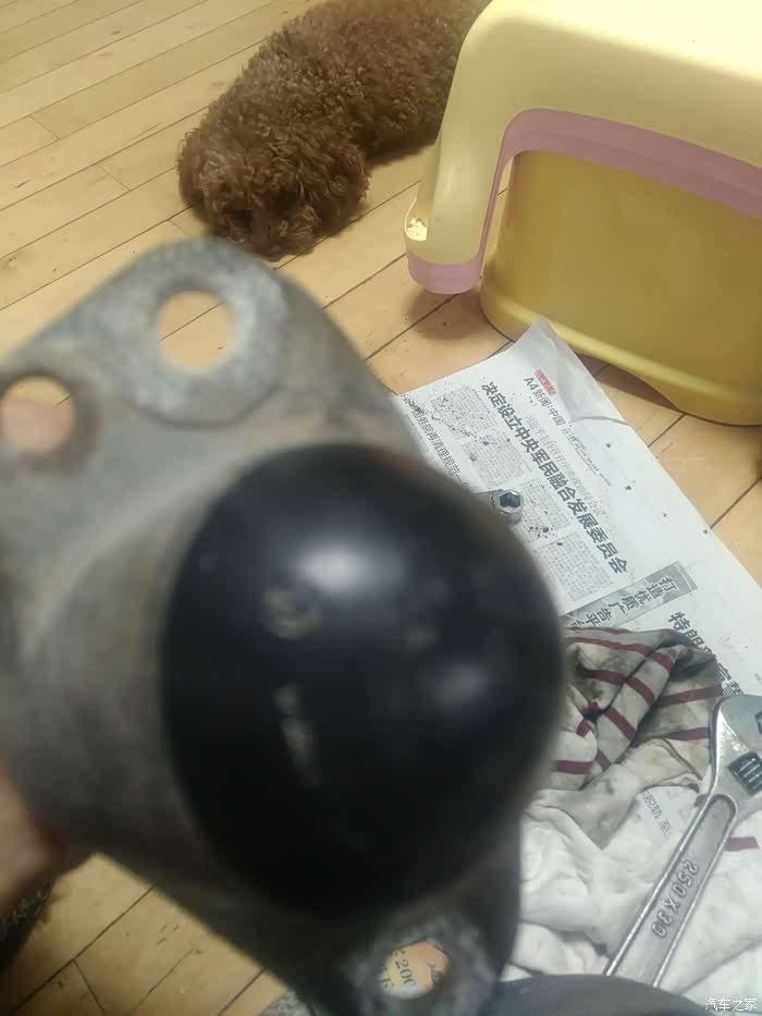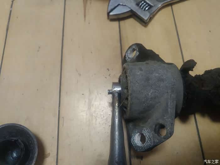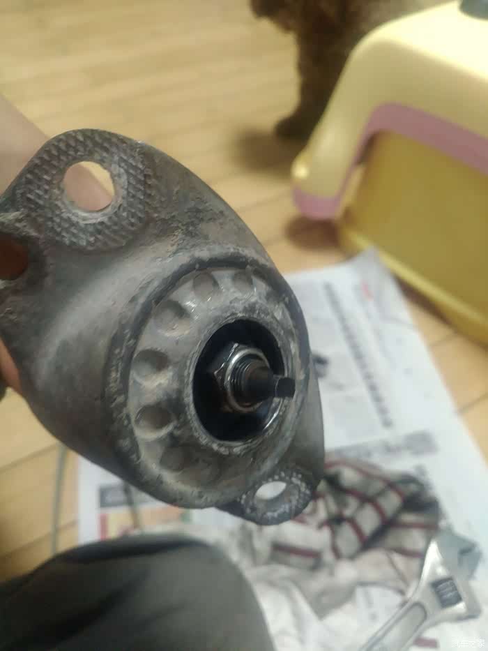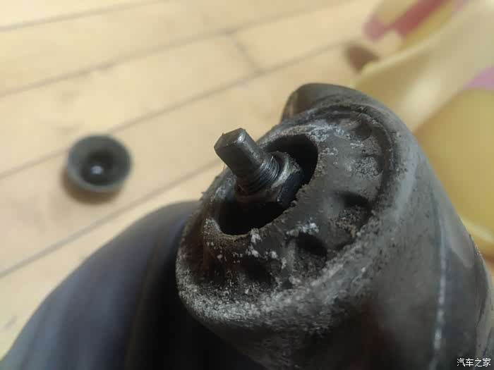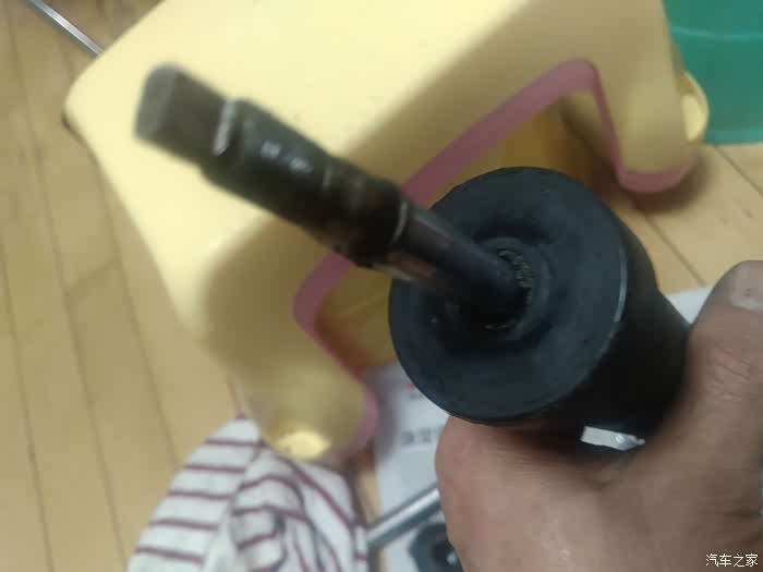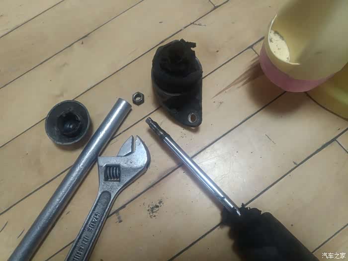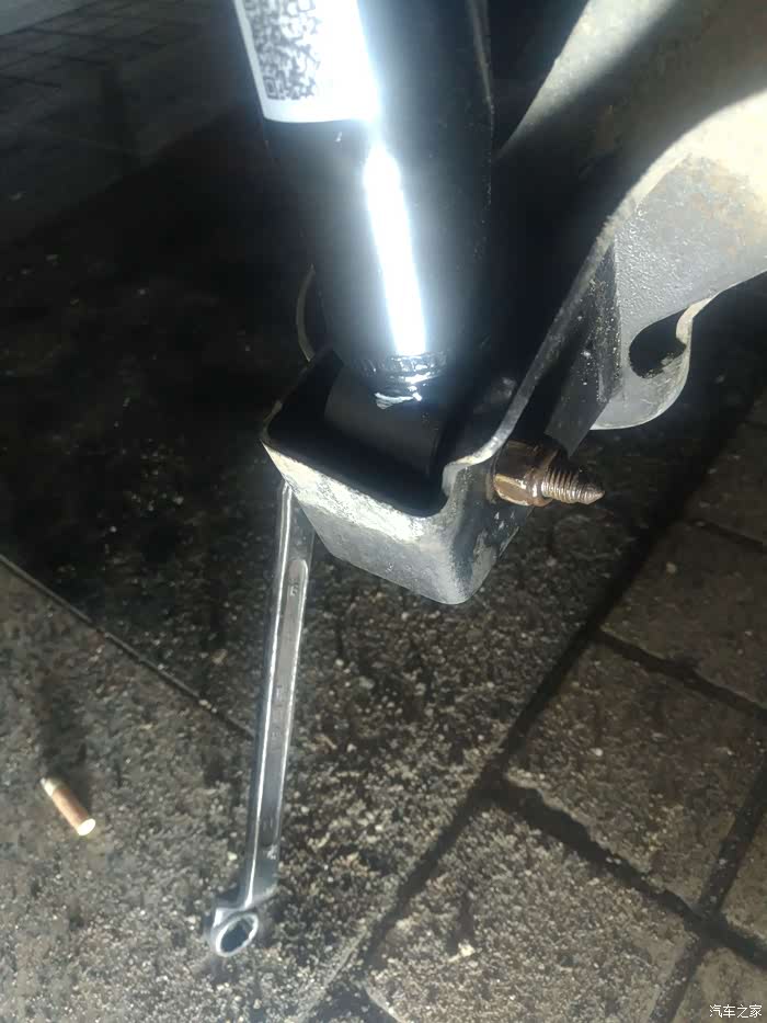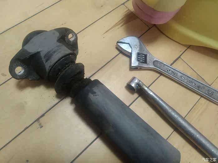 这两样工具就能打开了,下面的套筒是现做的,因为发现普通的套筒卡不进减震轴杆螺丝,这个螺丝基本和座体是平面的,这样做可以向下探下去,也方便上面用活板子卡住轴心