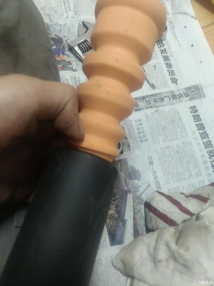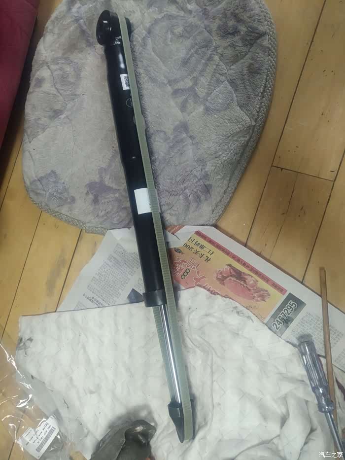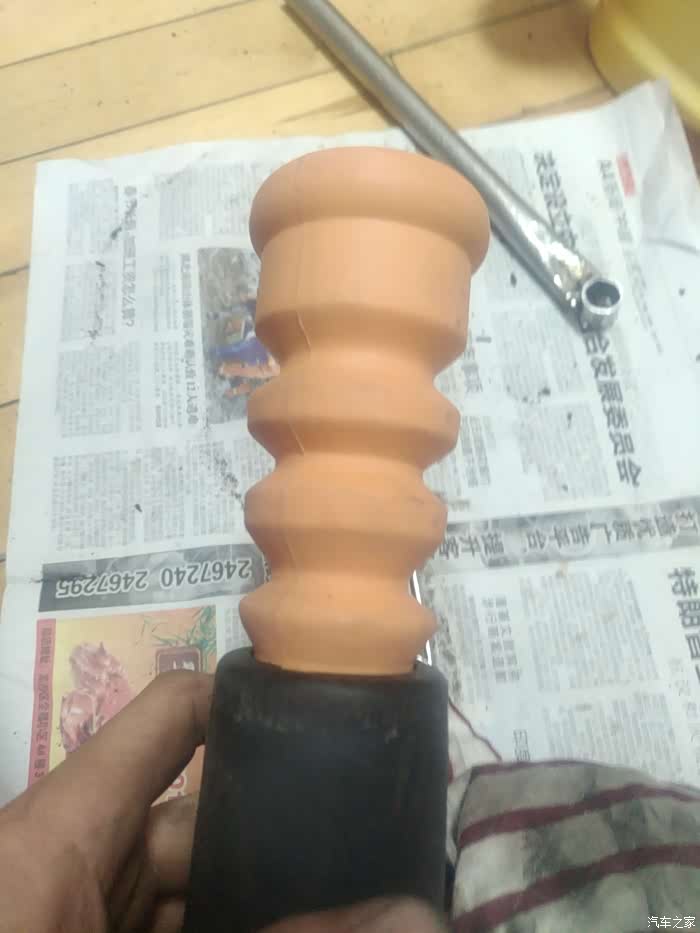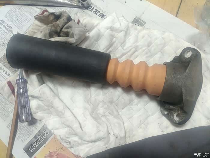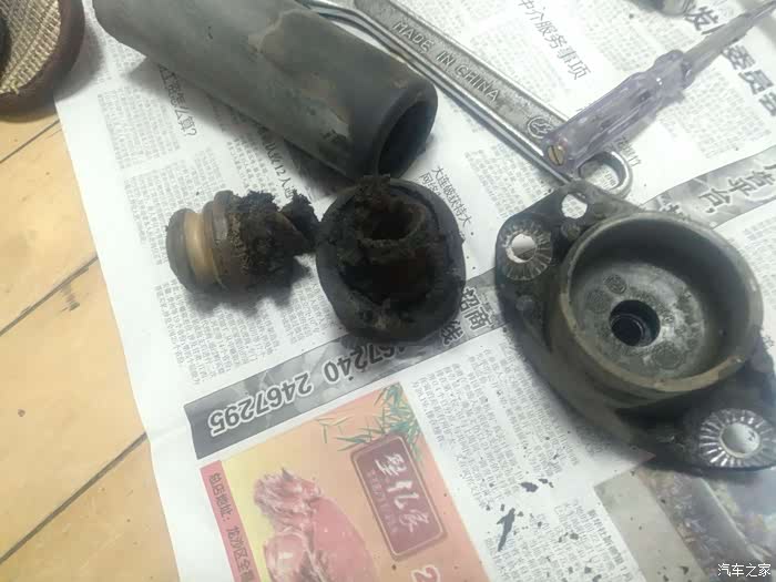 面临两种选择:换总成,换减震芯。检查其他小件都完好,如果换总成,缓冲胶还是那个不敢恭维的材质,不抗造,决定还是换减震芯,另配缓冲胶