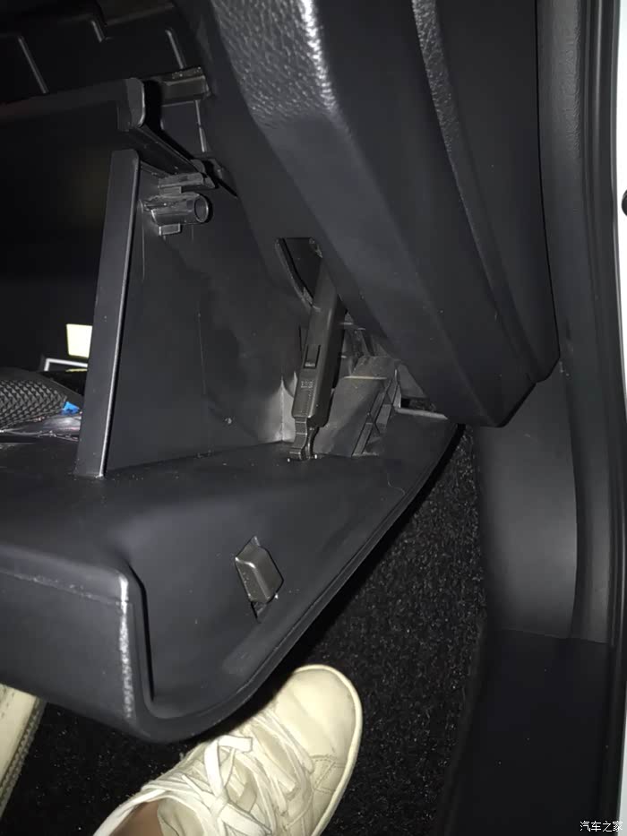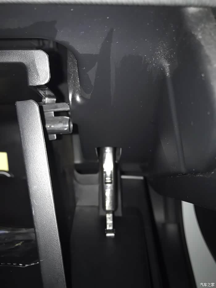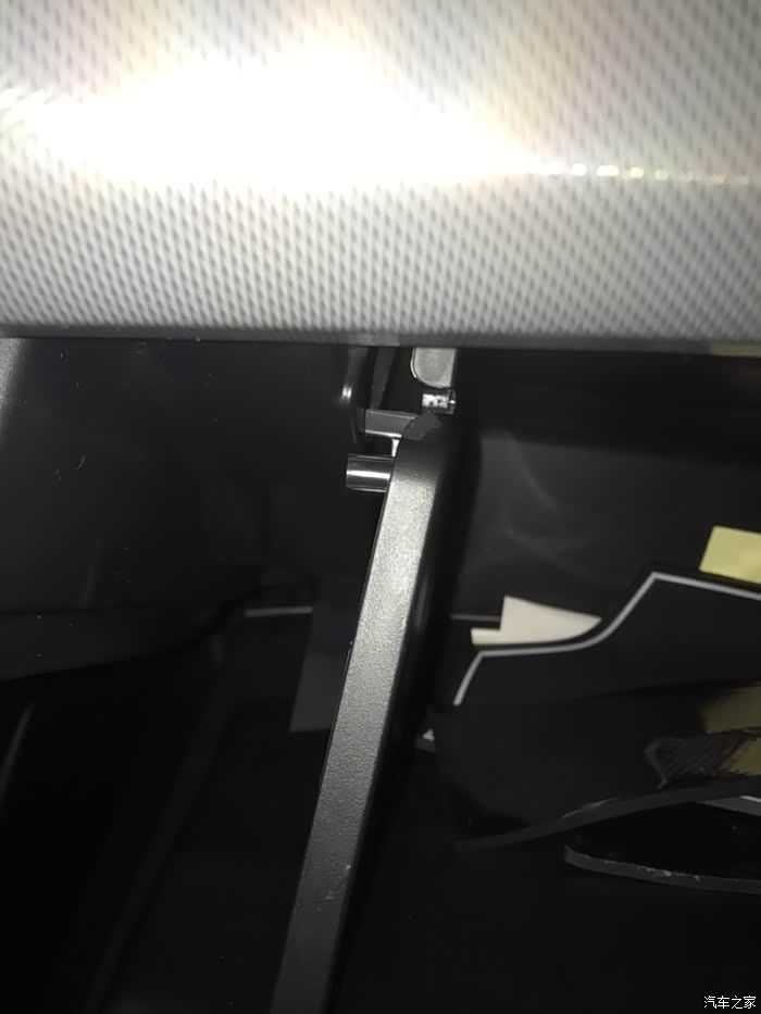 3、打开手套箱后,在右侧靠近车门那边,你会看到有个阻尼杆,反正也就只有一条。