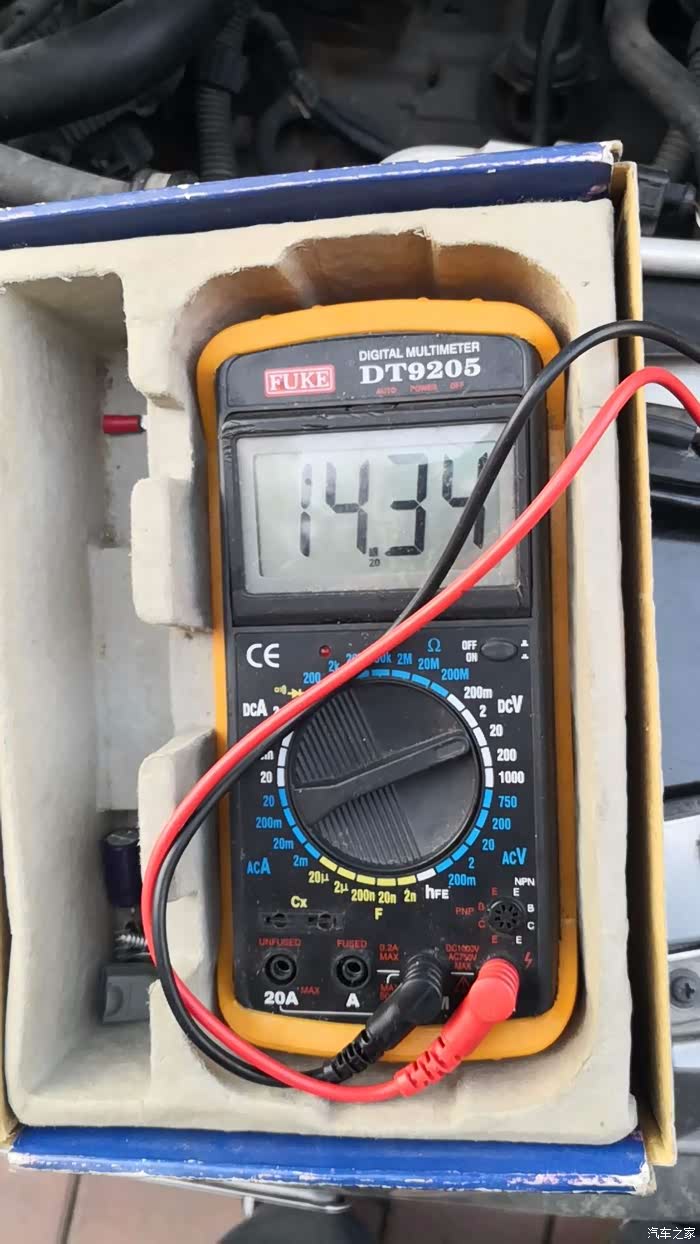 电压14.34V,请忽略我山寨的万用表。哈哈哈哈哈