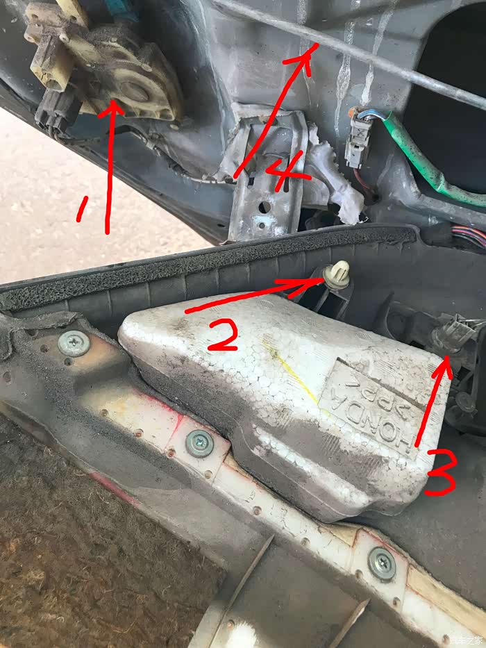 内饰板与车门分离开,1是车门上的门锁遥控电机,2是内饰板上的卡扣,3是内饰板上的迎宾灯连接线,4是车门上的门锁拉杆。要将迎宾灯连接线拔掉才能完全取下内饰板