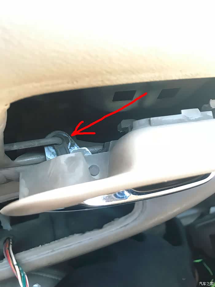 即可看到门锁拉杆(箭头所指处),此拉杆是钩在杠杆连接件上的,小心将拉杆从连接件上脱开,既可拿下拉手盖板