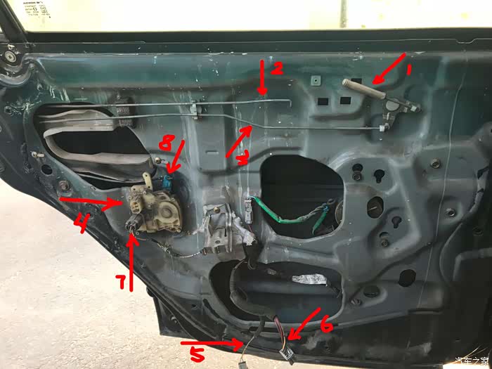 取下内饰板后可看到上图,1是遥控锁顶端,只不过没有支撑倒了;2是手动开门把手连接的拉杆;3是遥控锁拉杆;4是遥控锁电机,这是我们要重点研究的东西;5是迎宾灯电缆线;6是门窗玻璃升降机电缆线;7是遥控锁电机电缆线;8是遥控锁电机与拉杆连接处。注意以上位置和作用要搞清楚,待往回安装时不要搞错。