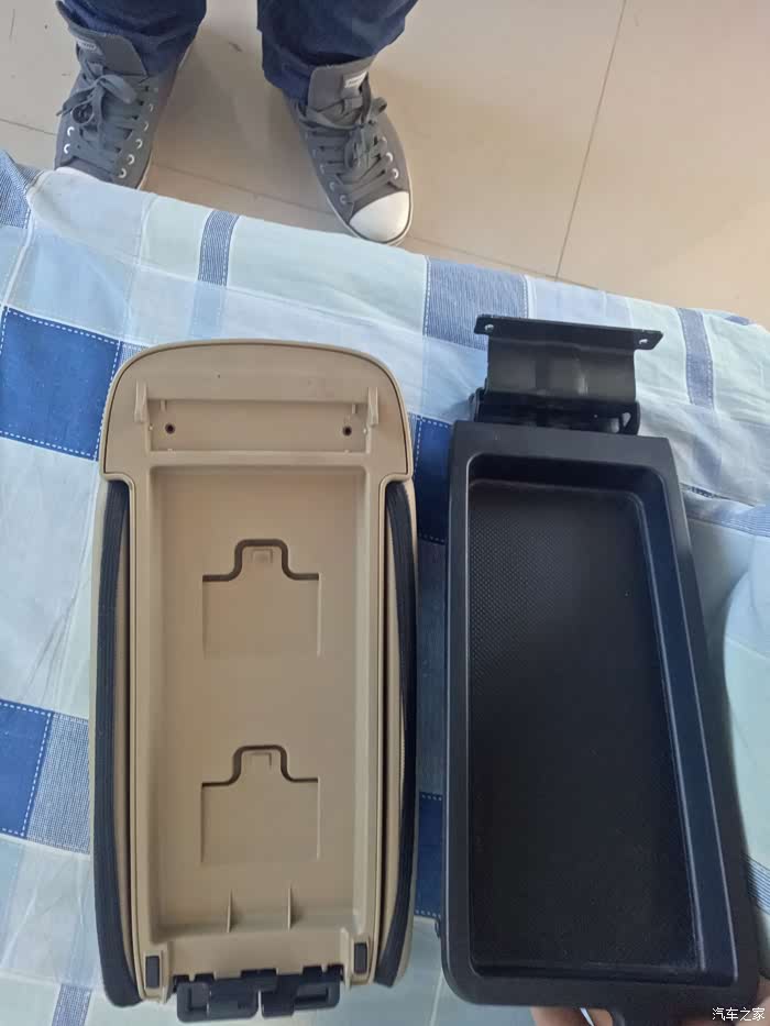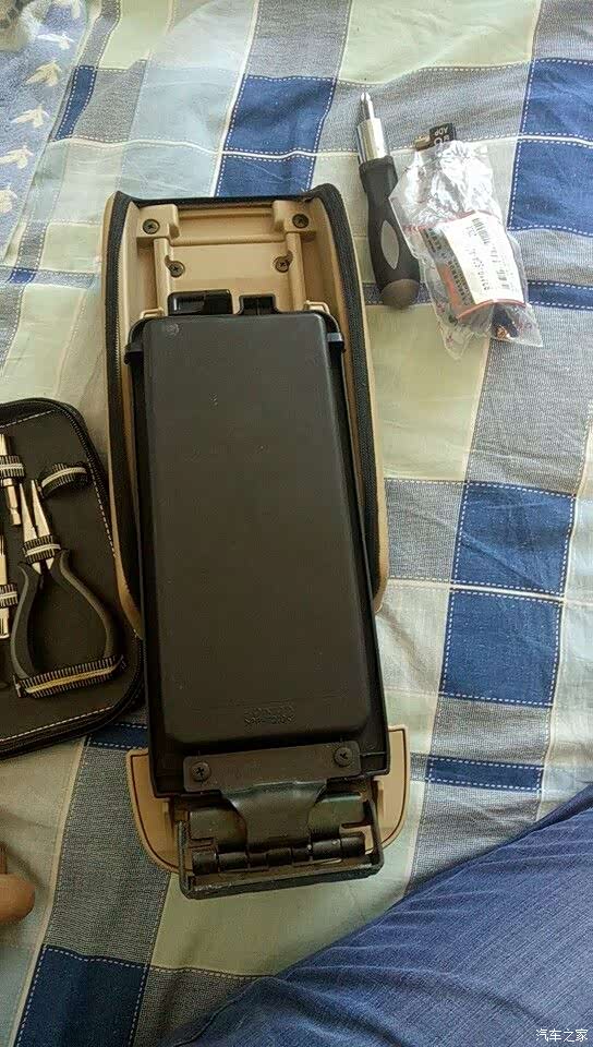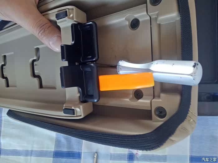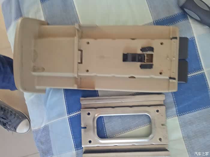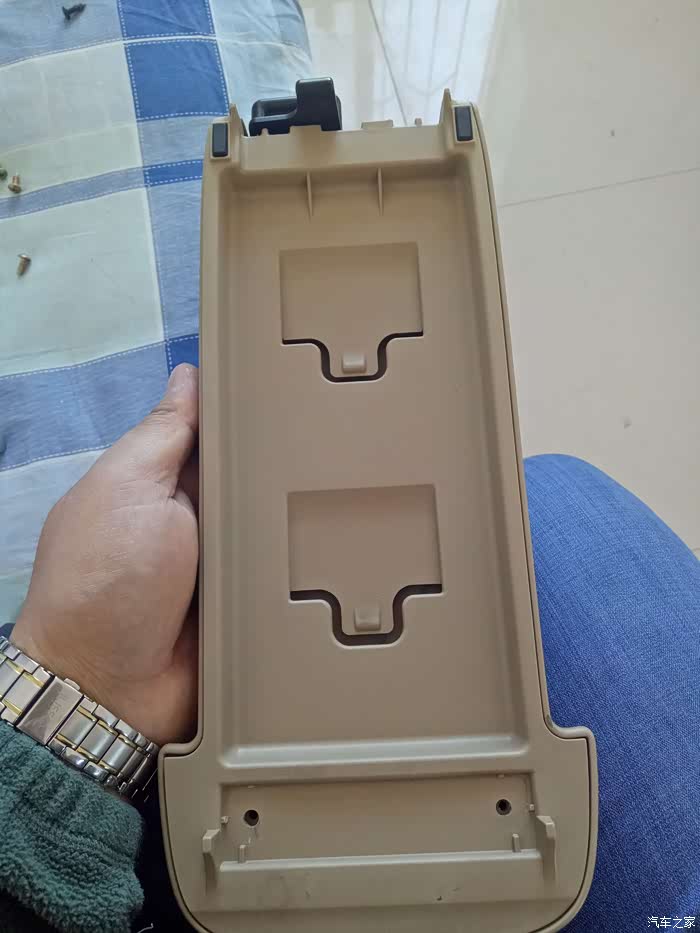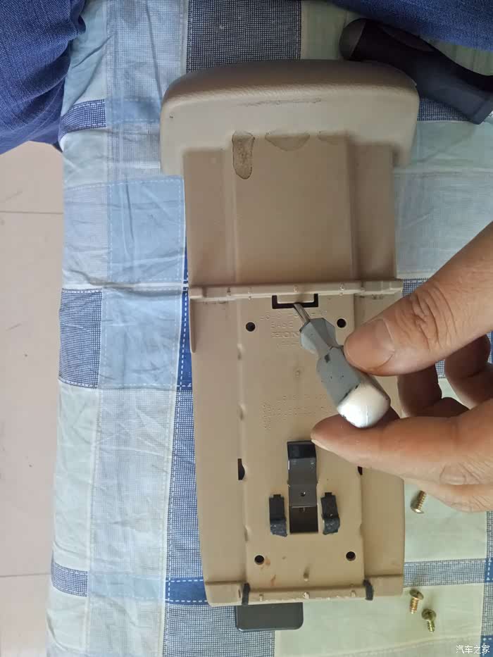 取下来之后再把这两颗螺丝卸掉就把扶手箱上层和扶手箱盖分离了