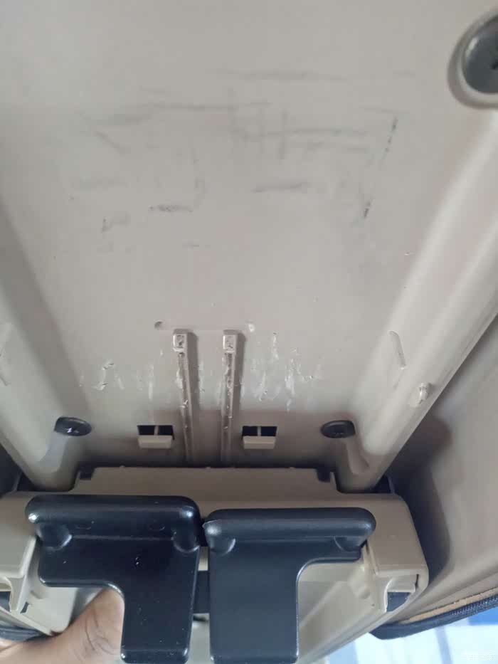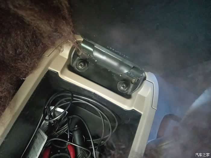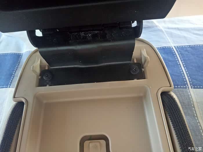 打开扶手箱 卸掉这两个螺丝,这样扶手箱盖就取下来了