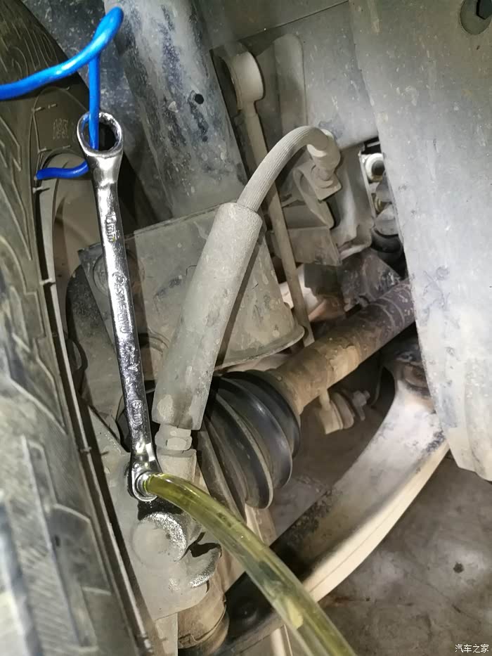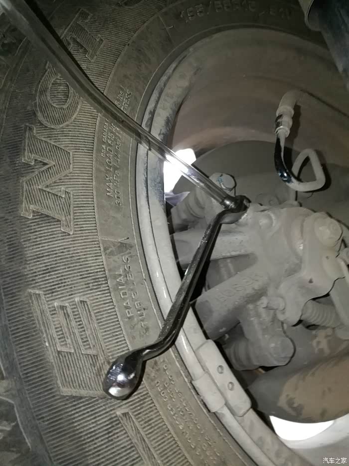 要事先找一截60cm的铝线,一头栓在梅花扳手的另一头,固定在轮毂上,因为你松开排气嘴,如果不固定,扳手因重力原因又扭回去了,刹车踩不下去。