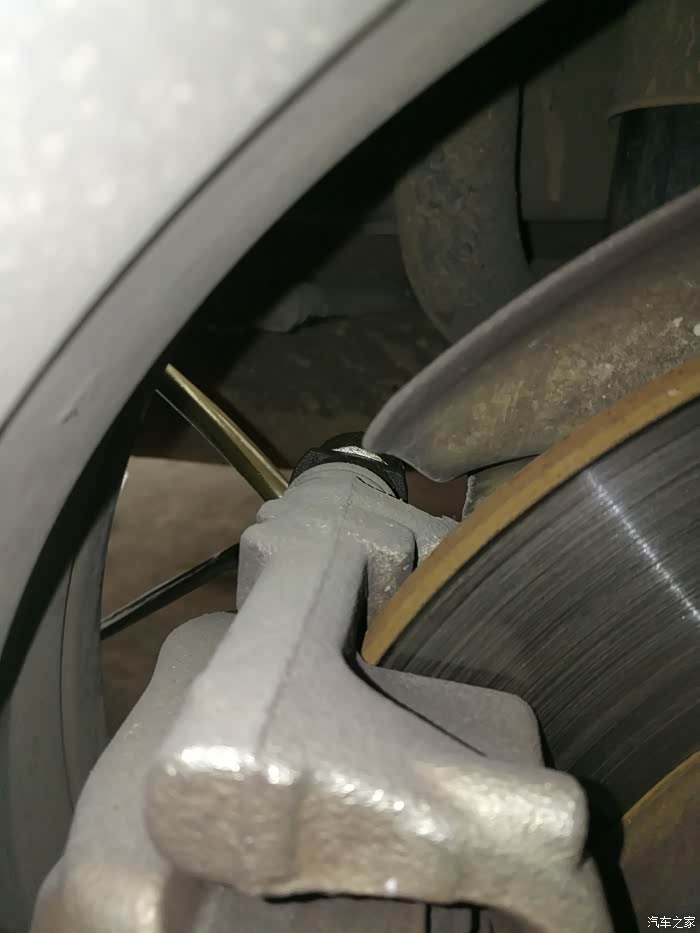 排气嘴,扳手松90度左右,踩刹车3-4脚到底,油壶加满。