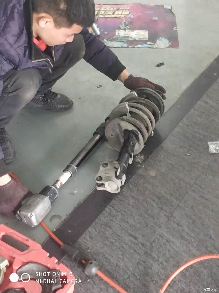 小哥还是很专业,吃饭时间都帮我装,这个是专业拆装减震工具,把大弹簧压紧才能拆,装上新减震再松开大弹簧。