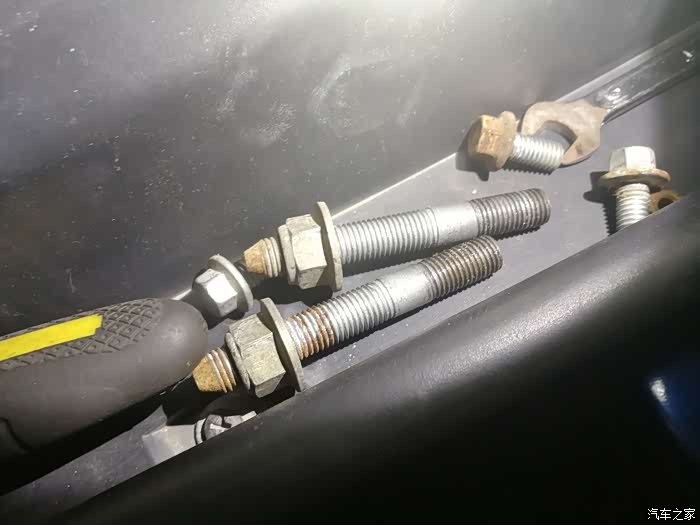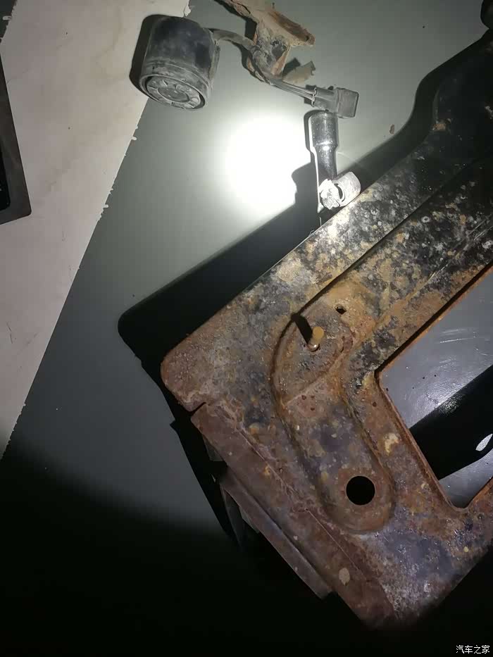 这是电瓶托架的反面,也就是朝下的那面,腐蚀的比较厉害,这个螺栓是防盗器报警喇叭的安装位