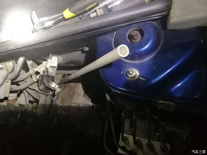找了一段线管,长度正合适,管口垫上布,慢慢把两升变速箱油加进去了