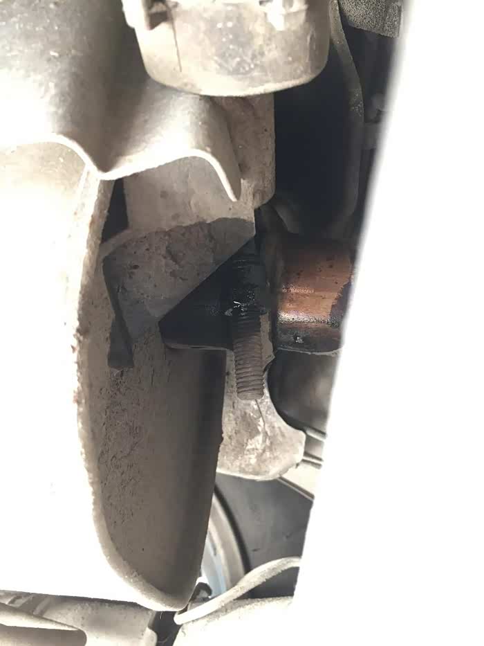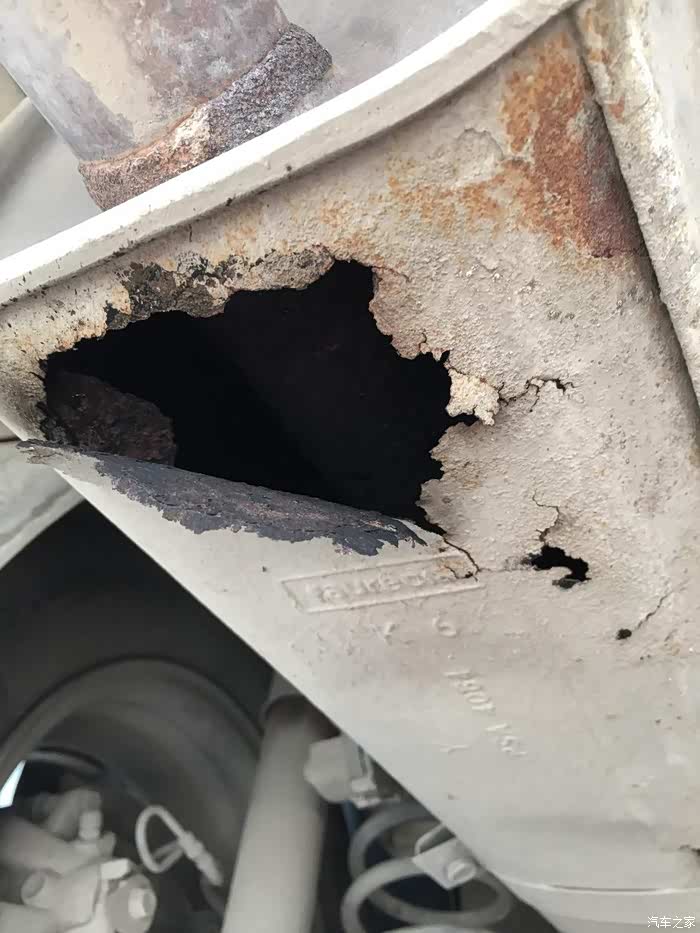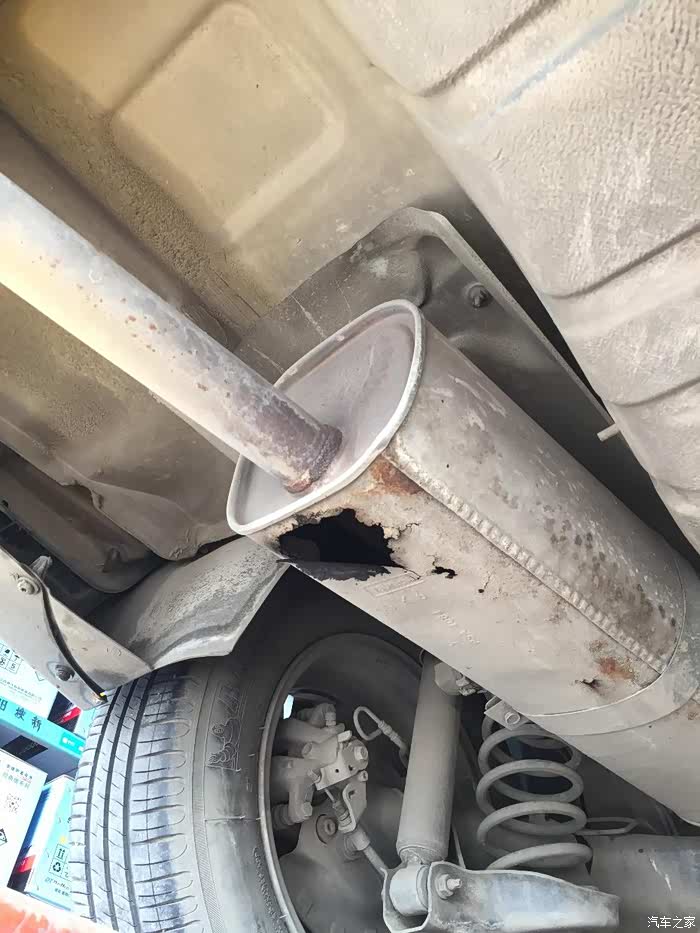 车子开上举升机。你看看,排气管烂通个大洞