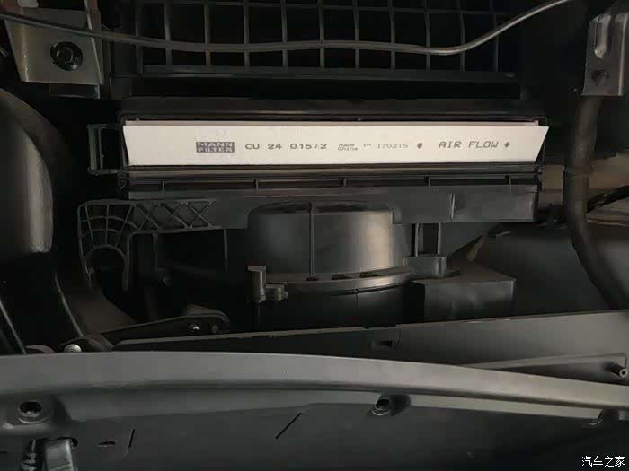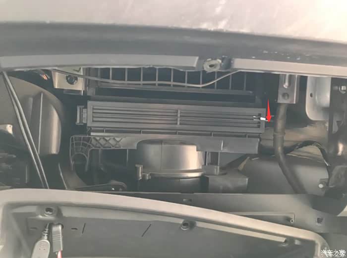 按住红色箭头处的卡子,即可拆下滤清器盖板。