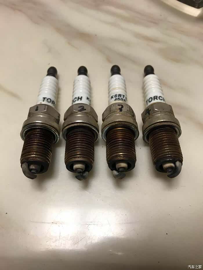 换下来的原车火花塞是火炬的,感觉间隙有点大,第一缸丝口有机油。