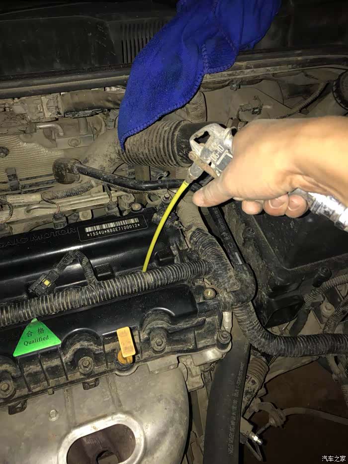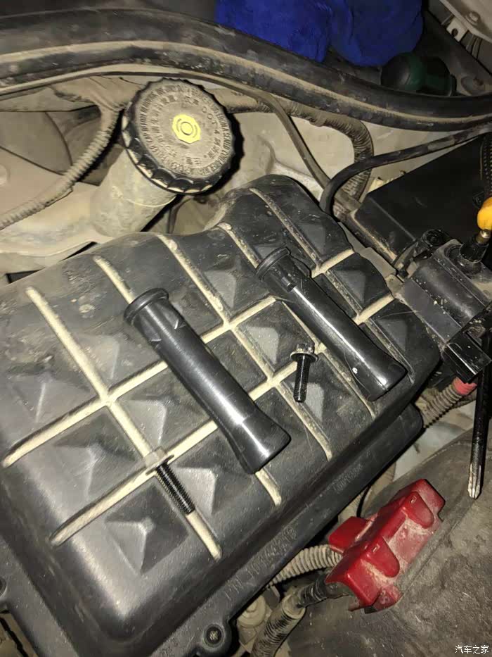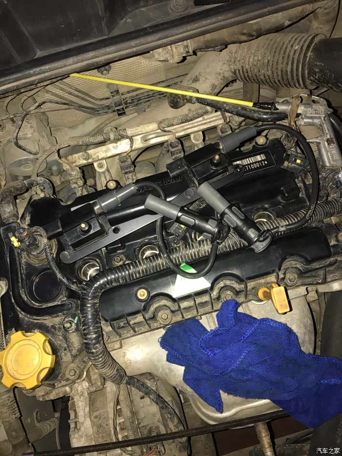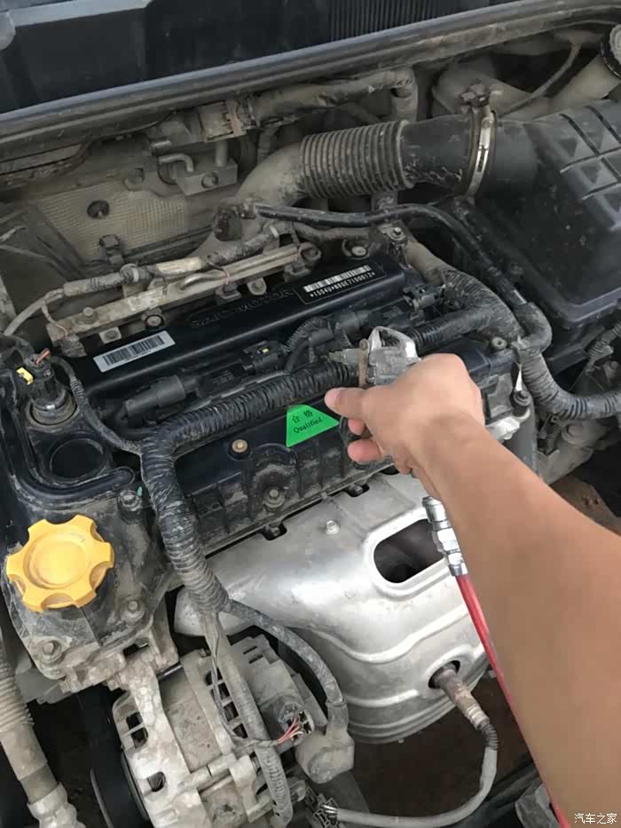 够着不好用力,只有站到发动机仓上。由于结构原因,1缸和3缸可以直接拔出来,但是2缸和4缸的胶套拔不下来。用老虎钳子夹住拉出一点,然后另一只手抓住使劲拉。