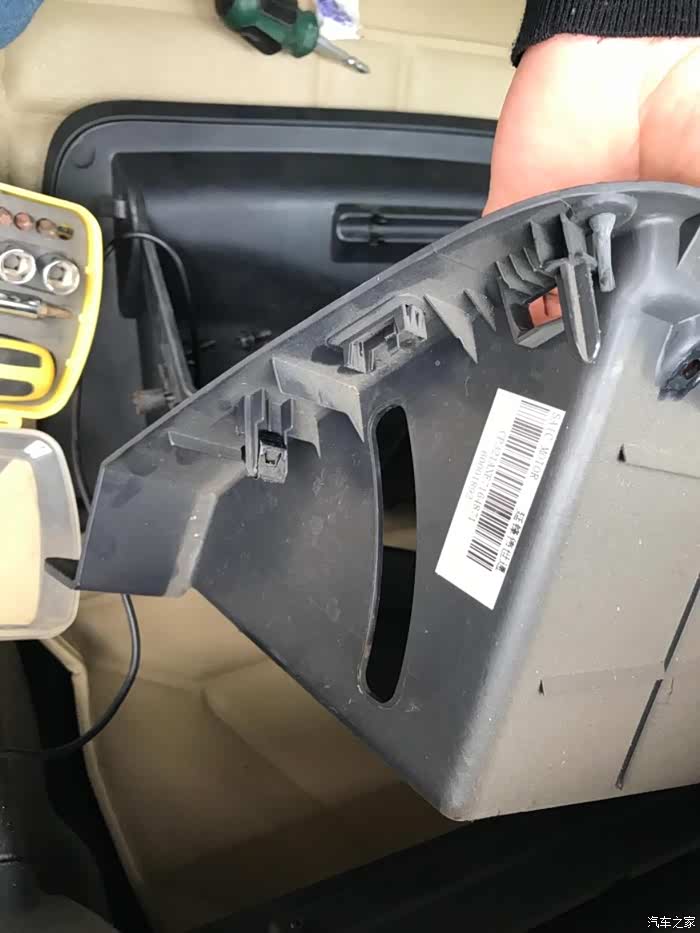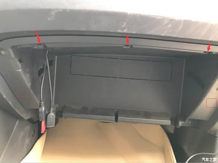 拔掉塑料轴,打开手套箱即可取下手套箱。图中,USB延长线是自己换的大屏导航的数据线,忽略。如果想以后更换空调滤清器方便点的话,可以把图中的长方形挡板沿虚线割掉,就不需要拆螺丝了。我还是选择拆螺丝,因为我不怕麻烦。