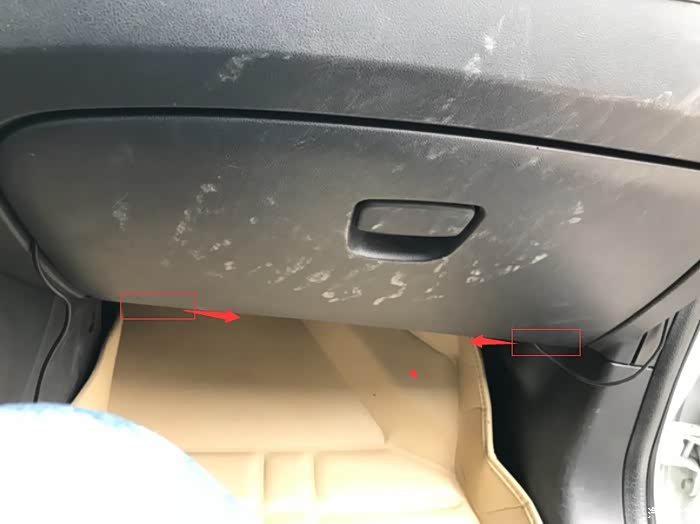 用手摸手套箱底部,如图,方框处是两个塑料轴,沿箭头方向拔下,摸不到的话,可以低着头看,小心脖子扭到了,最好先运动一下脖子