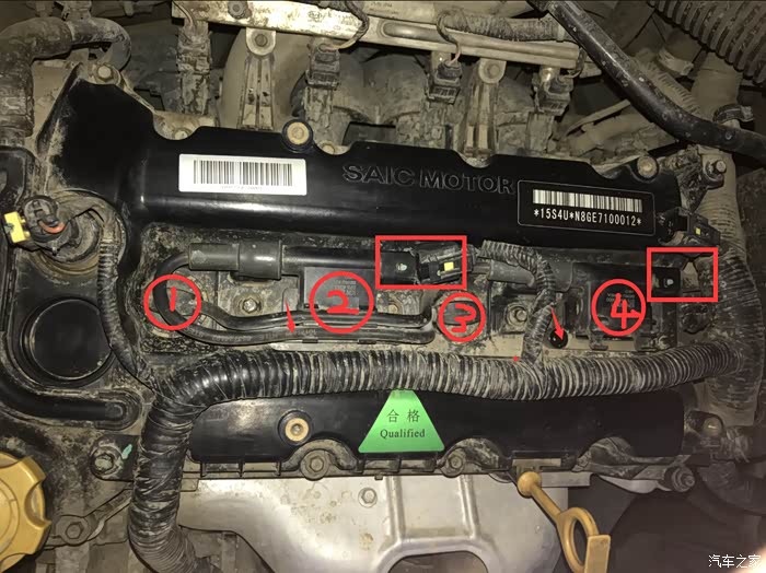 如图,2和4为点火线圈,1和2为分火线,1缸和4缸共一个点火线圈,2缸和3缸共一个点火线圈,先拔掉长方形两处线卡,再用8mm套筒拆除箭头两处螺丝。注意,点火线圈左右各一个螺丝,只需拆左边的一颗螺丝,右边的螺丝是固定在两个点火线圈之间的连接板上的。不需要拆除。