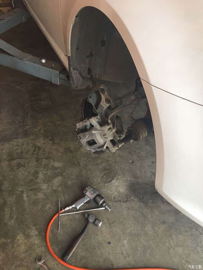 不光要拆轮胎,还要把传动轴(应该是这个名字)拆掉,不然变速箱抬不下来,说实话很麻烦,我看着都头疼