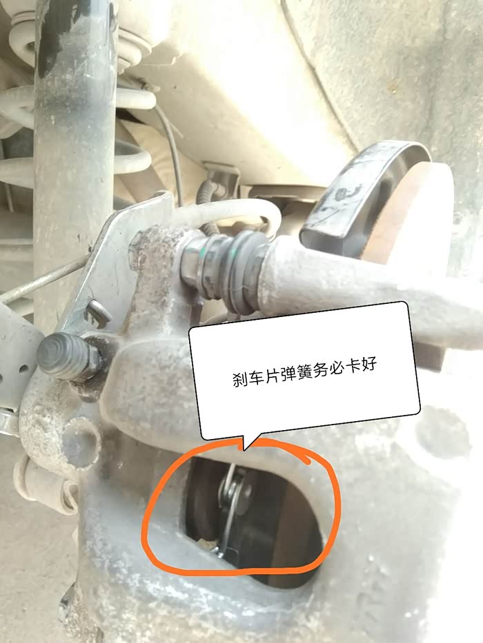 装入刹车片和分泵,图中红圈内的刹车片弹簧务必保证卡在分泵上,分泵要用力一些才能装回原位,拧紧分泵的两个固定螺丝就可以了