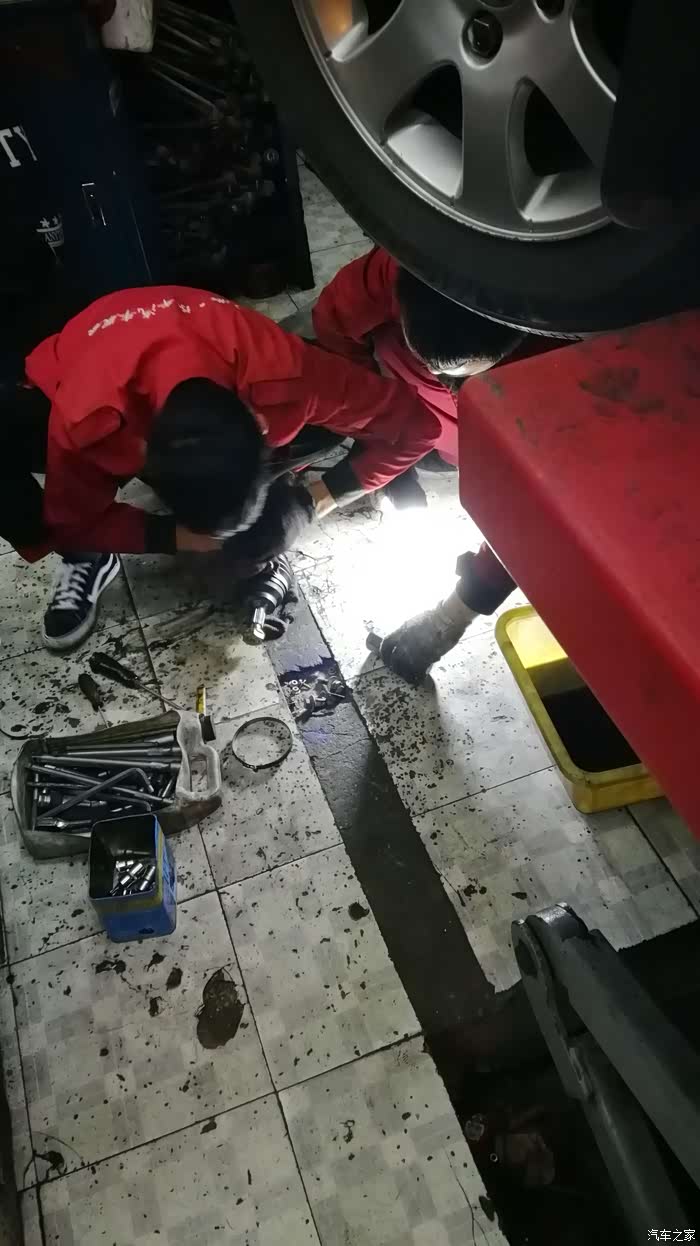 千斤顶顶了好久只见整车一起升降,拆了几颗螺丝以后,见发动机一起下沉,螺丝卡的很紧,心里没底,不敢再拆,又继续升千斤顶,还是只见车升,不见发动机升上来,这样来来回回好几次,最后心一横,想着也掉不到哪里去,就狠心拆了,拆完果然是沉了一点